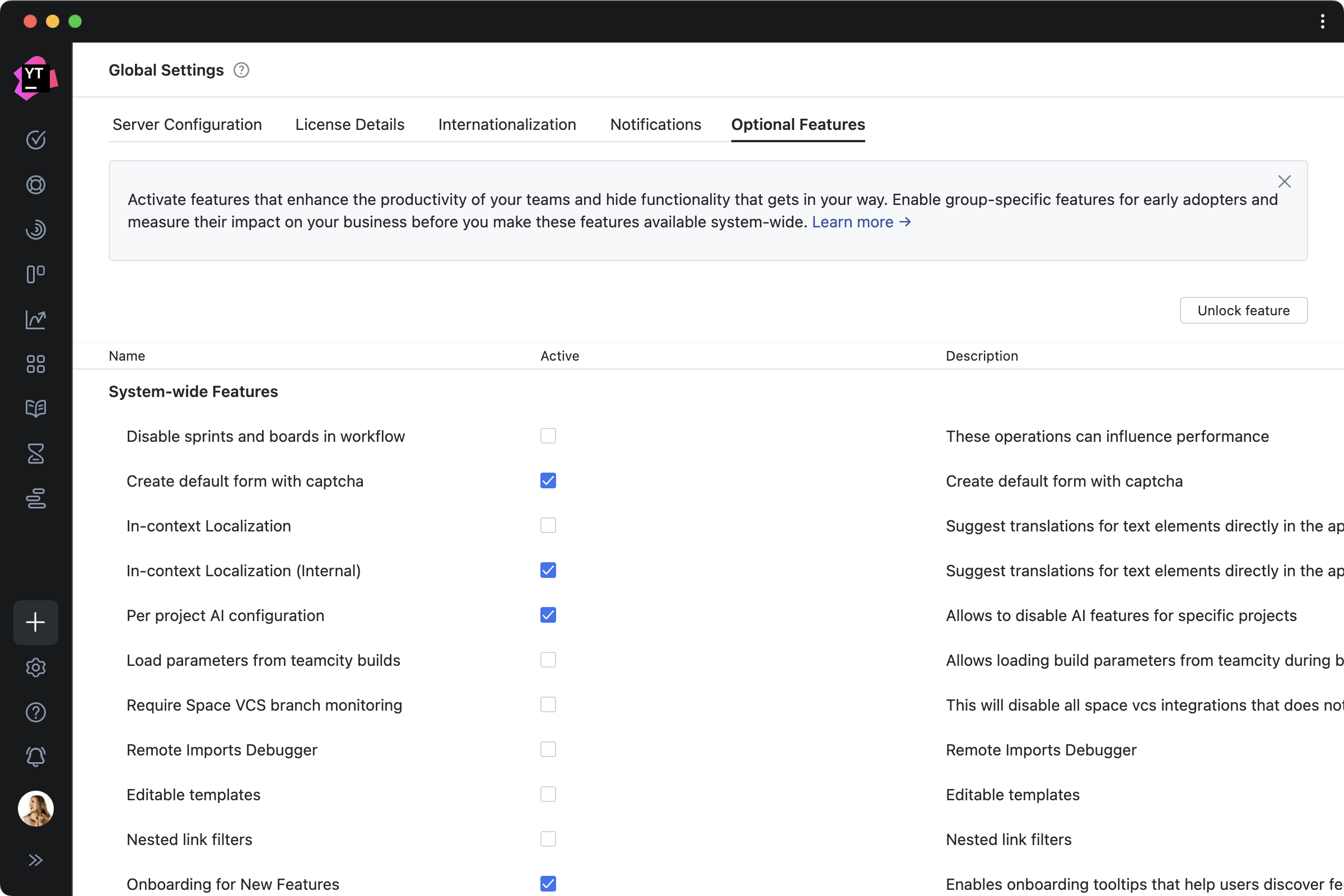 You can enable experimental features for your Cloud instance or Server installation. These features are in the early or intermediate stages of development. This strategy lets us get feedback on features as we work on them, which helps us learn more about what you want to see in the final product.