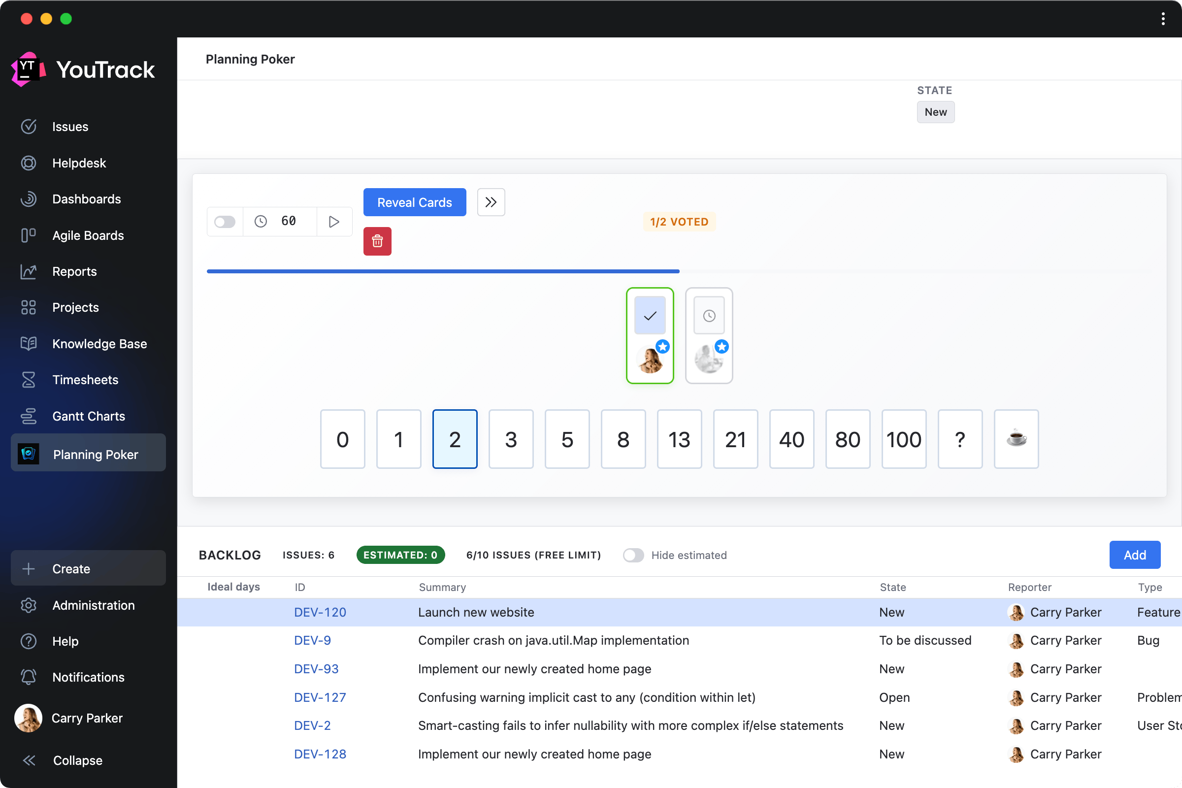 For example, the Planning Poker Estimation app helps gamify backlog estimation and facilitate real-time planning among team members from a dedicated section in the YouTrack menu.
