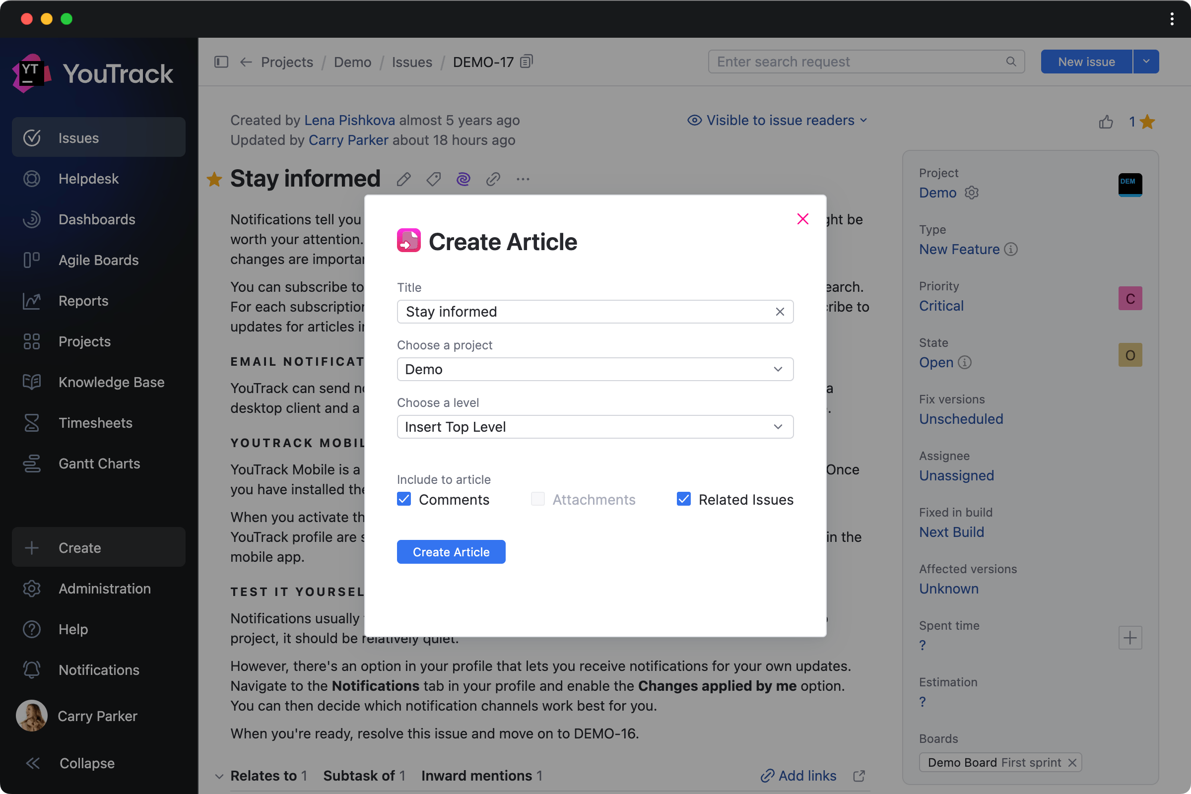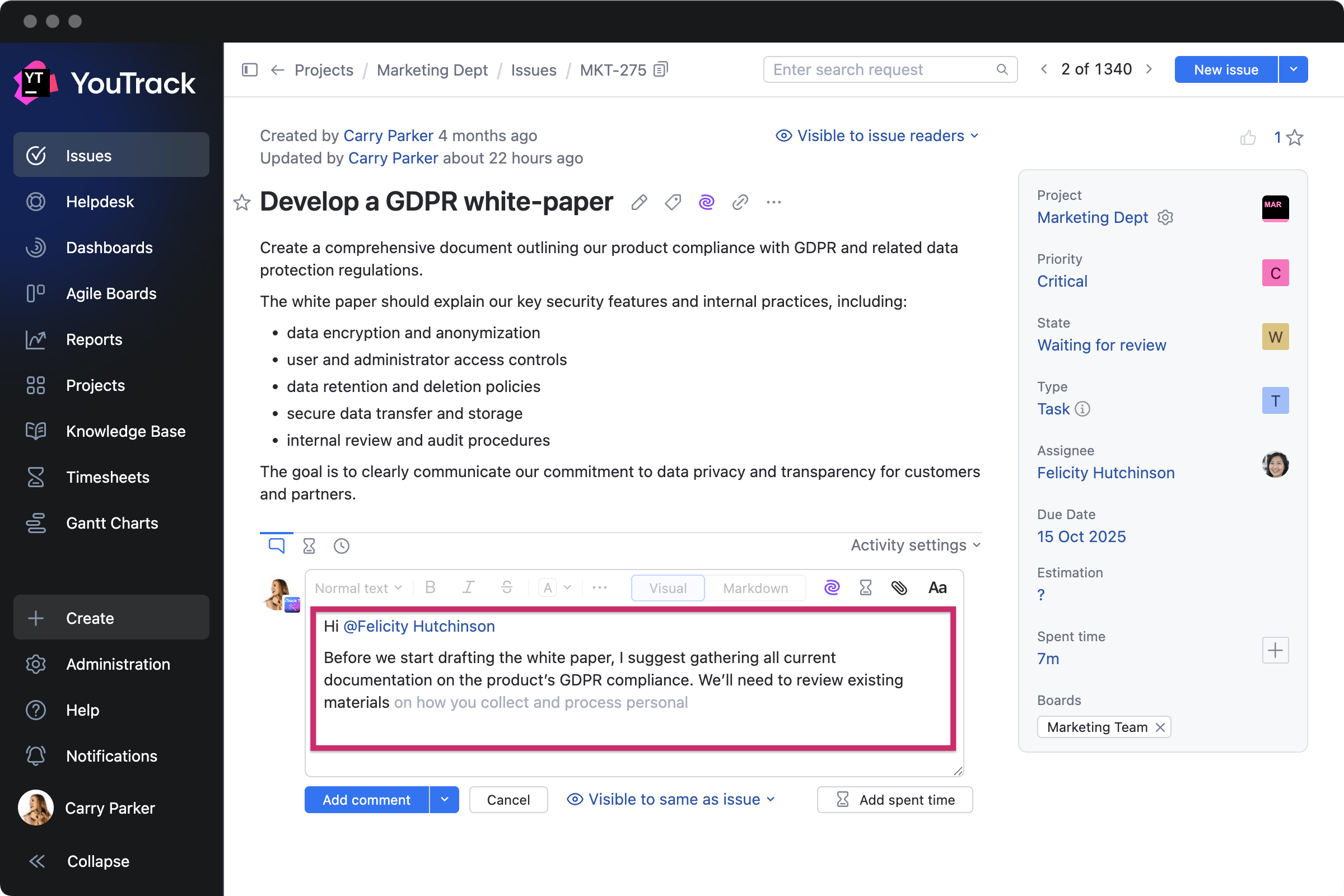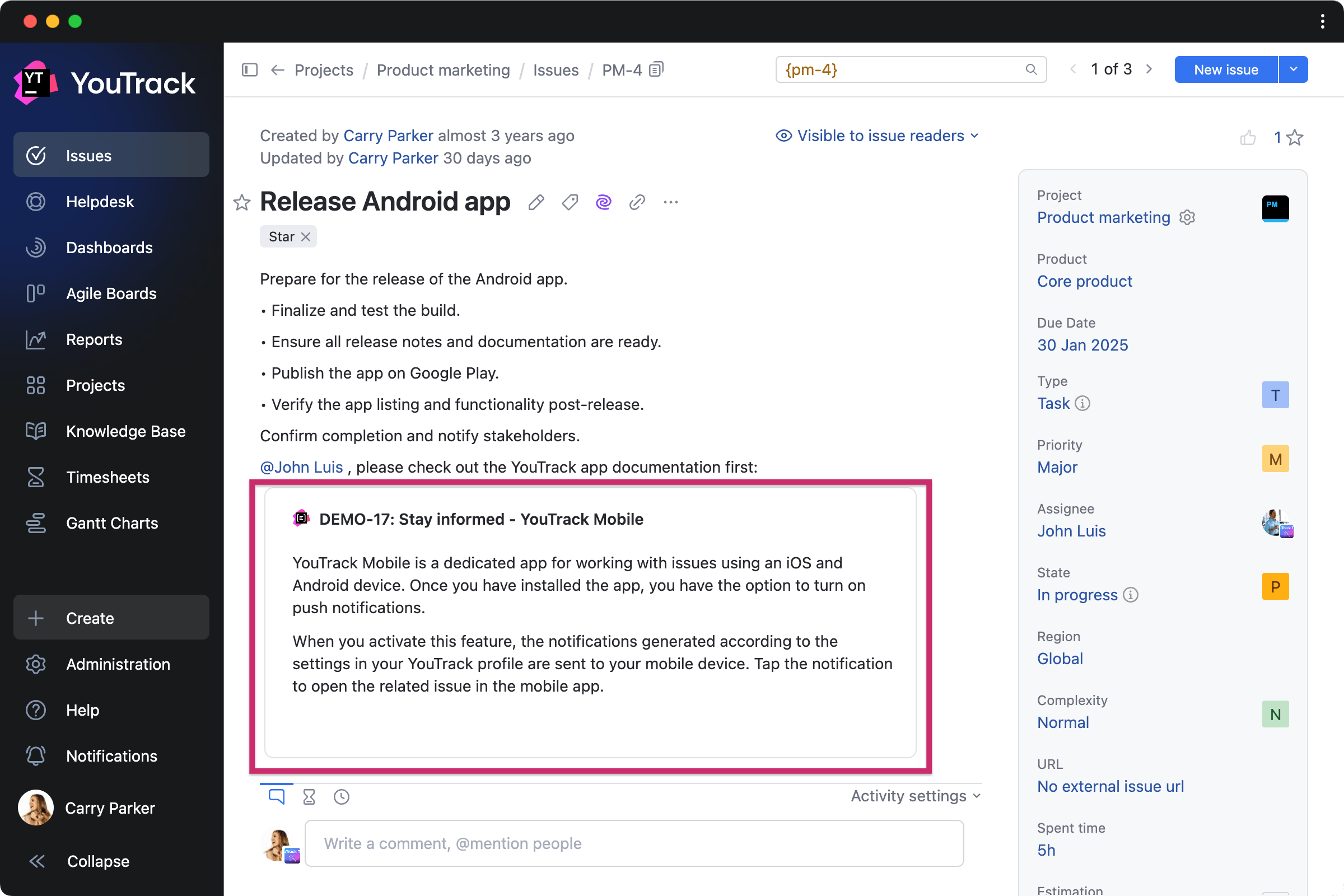 YouTrack’s writing assistance, powered by JetBrains AI for free, now suggests words and phrases as you type, helping you write task descriptions, comments, or whole articles faster than ever before. English and German are currently supported.