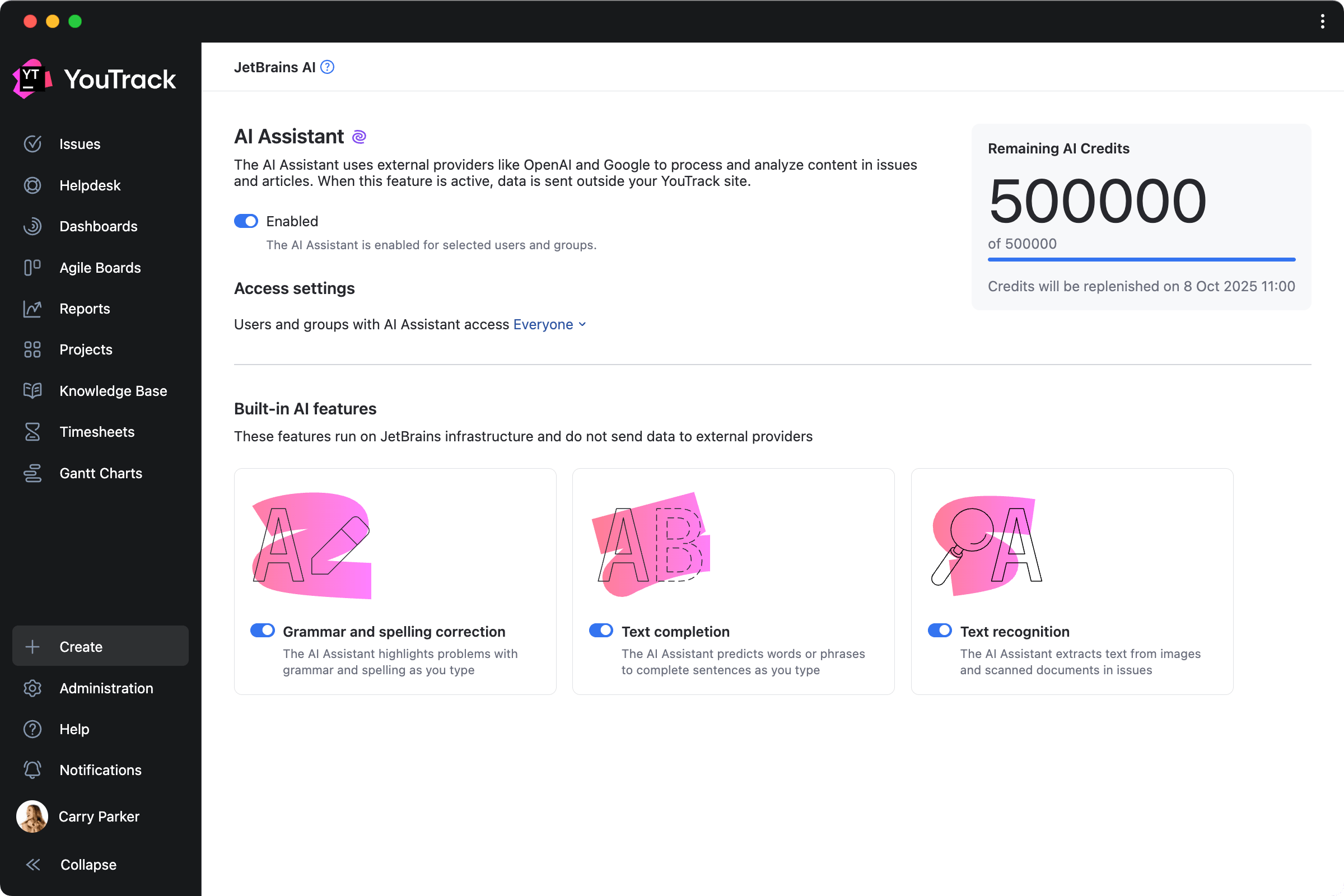We've updated the AI Assistant settings page to give administrators more control over which features are active for your YouTrack. We also added a dedicated tab to the profile settings so each user can choose which features they want access to.