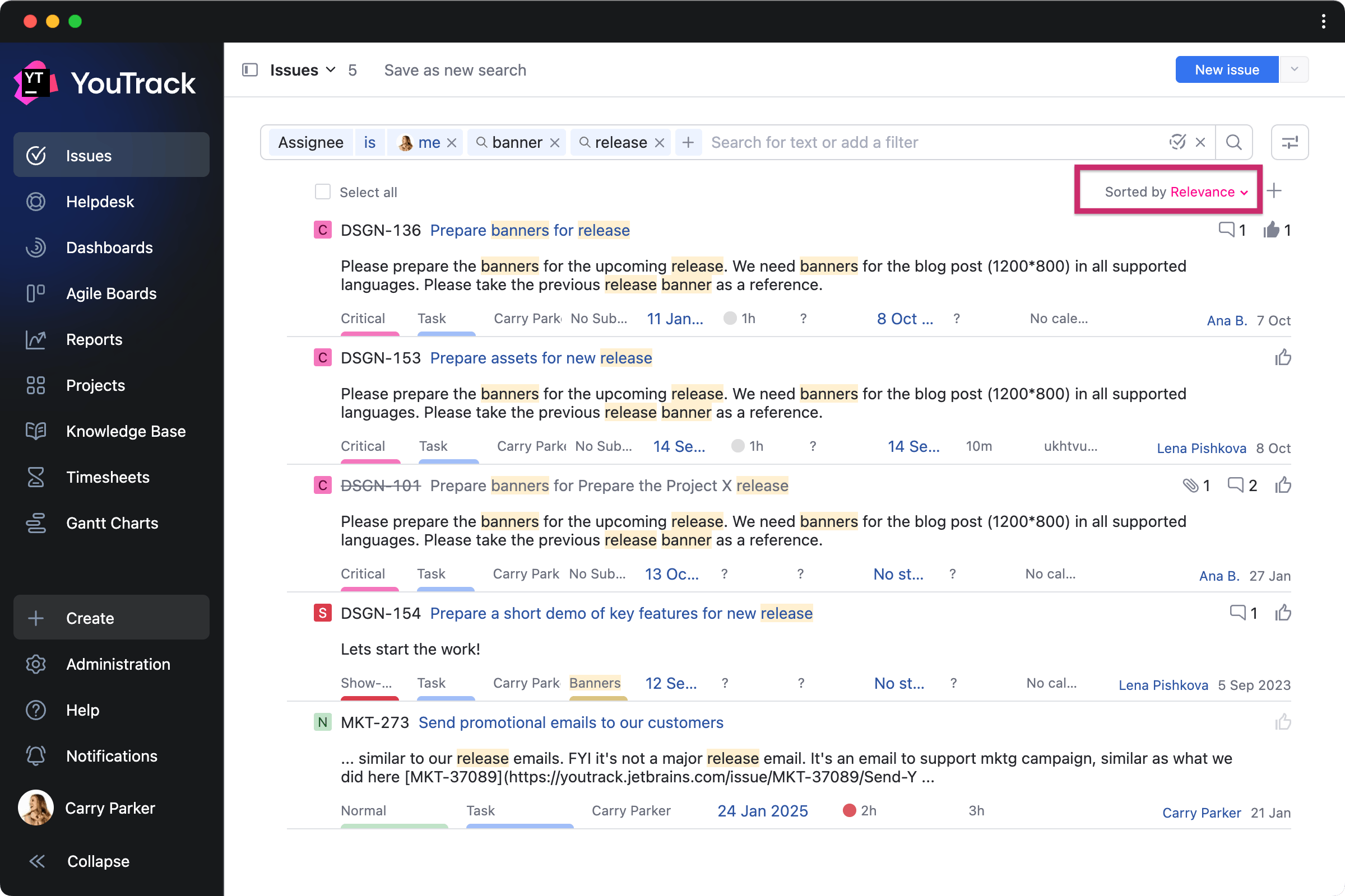 When searching on the Issues page, you now get more accurate results thanks to machine learning improvements. The most important tasks are highlighted based on attributes such as recency, user interactions, and personal relevance.
