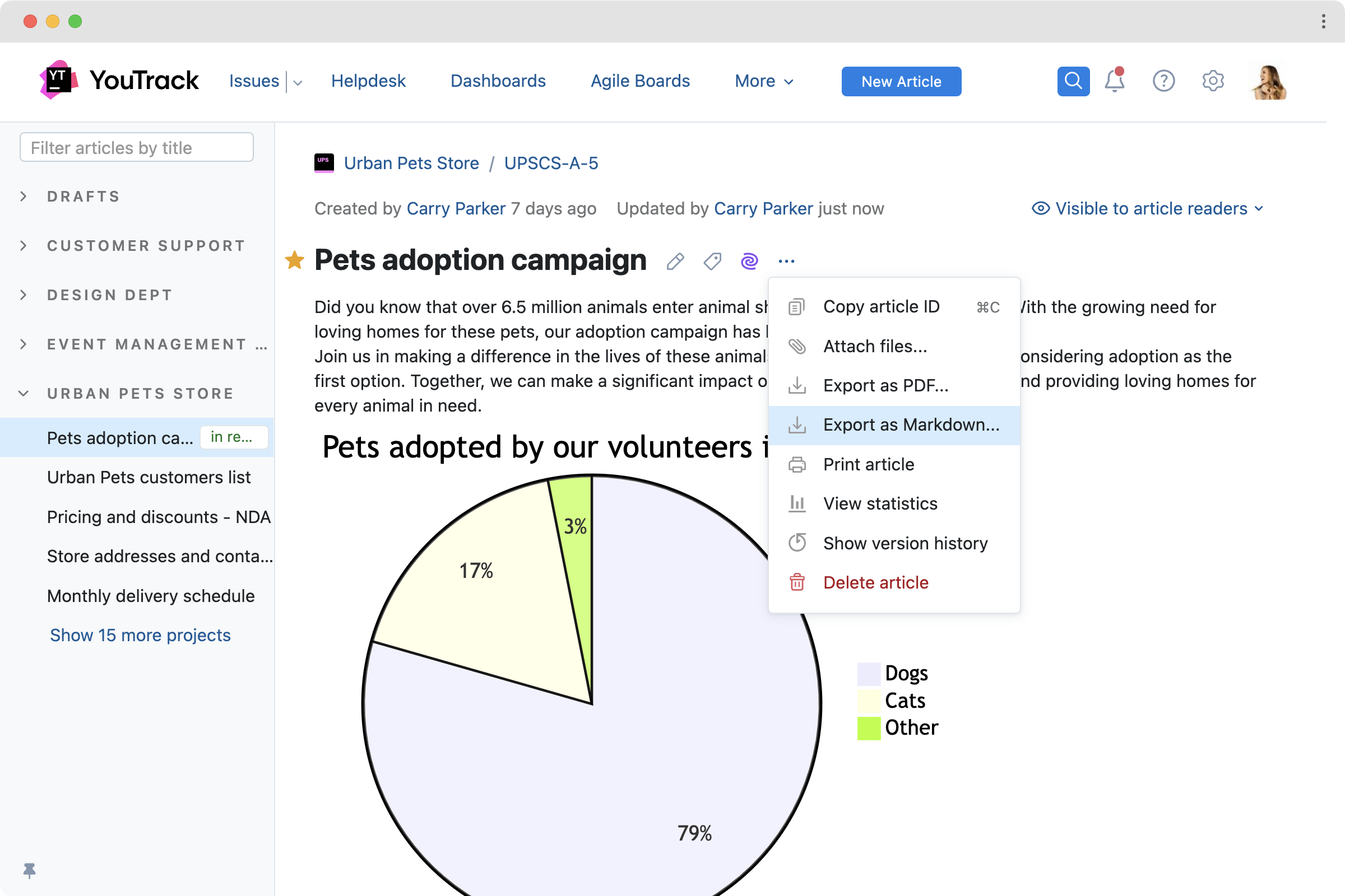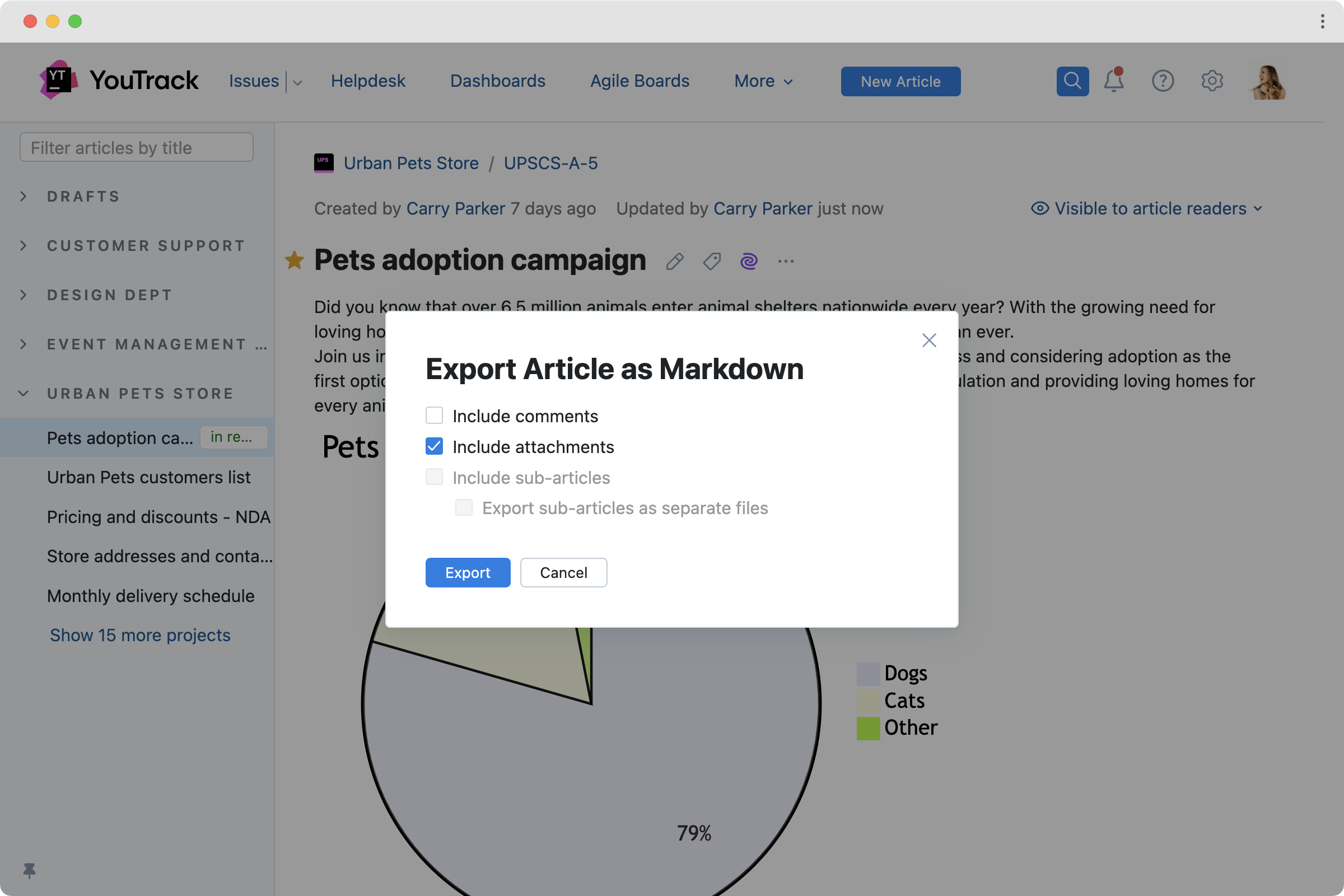 A new option lets you export articles as Markdown files. This makes it easier for you to transfer your content between different platforms, applications, and systems without losing formatting or structure. Choose whether you want to export individual articles or all of their sub-articles, comments, and attachments.