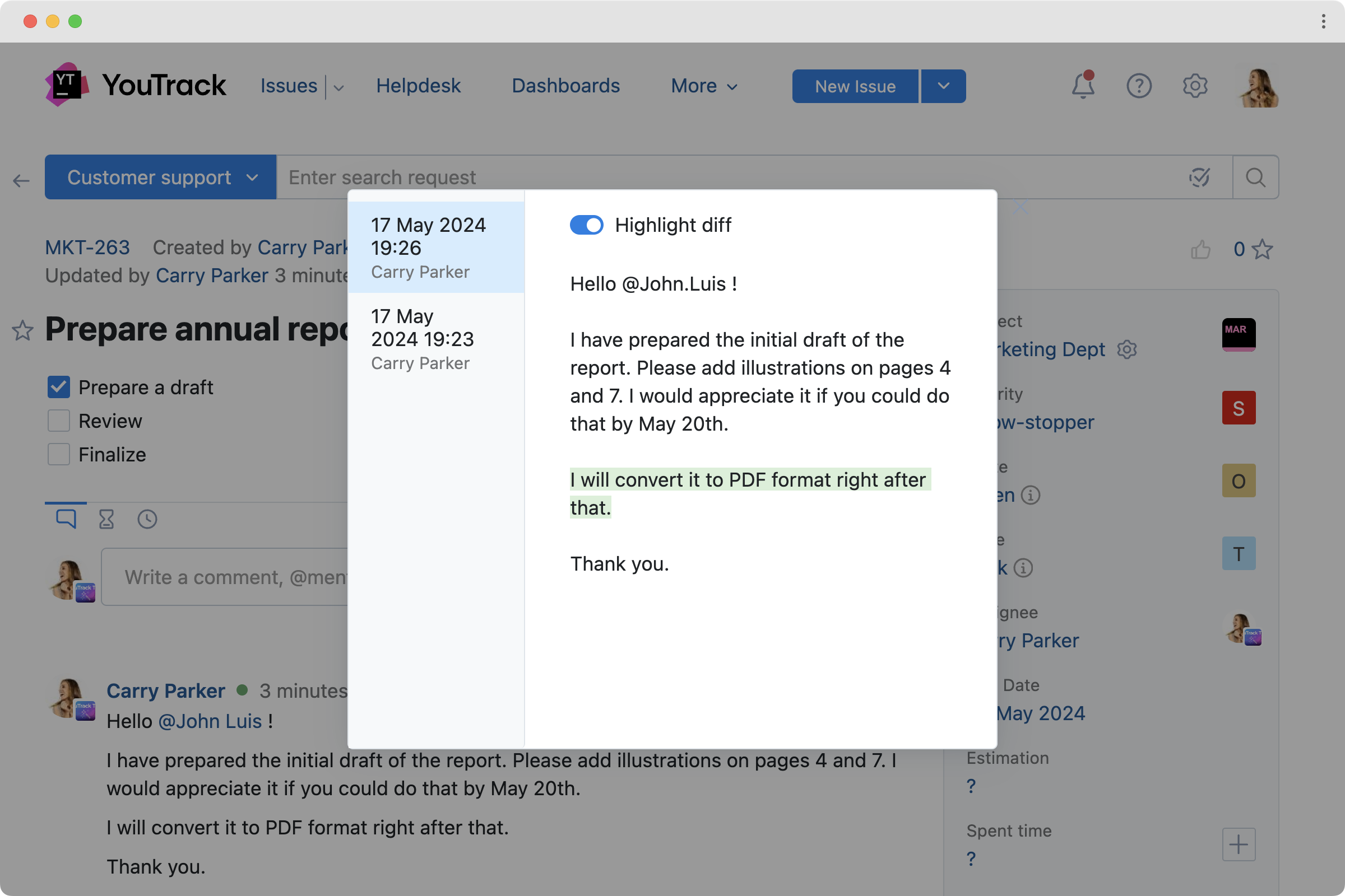 You can now review the complete history of changes applied to issue descriptions, articles, or comments. This transparency helps you know who made each change and when it was made. If the change was made in error or should be reverted, you can restore a previous version at any time.