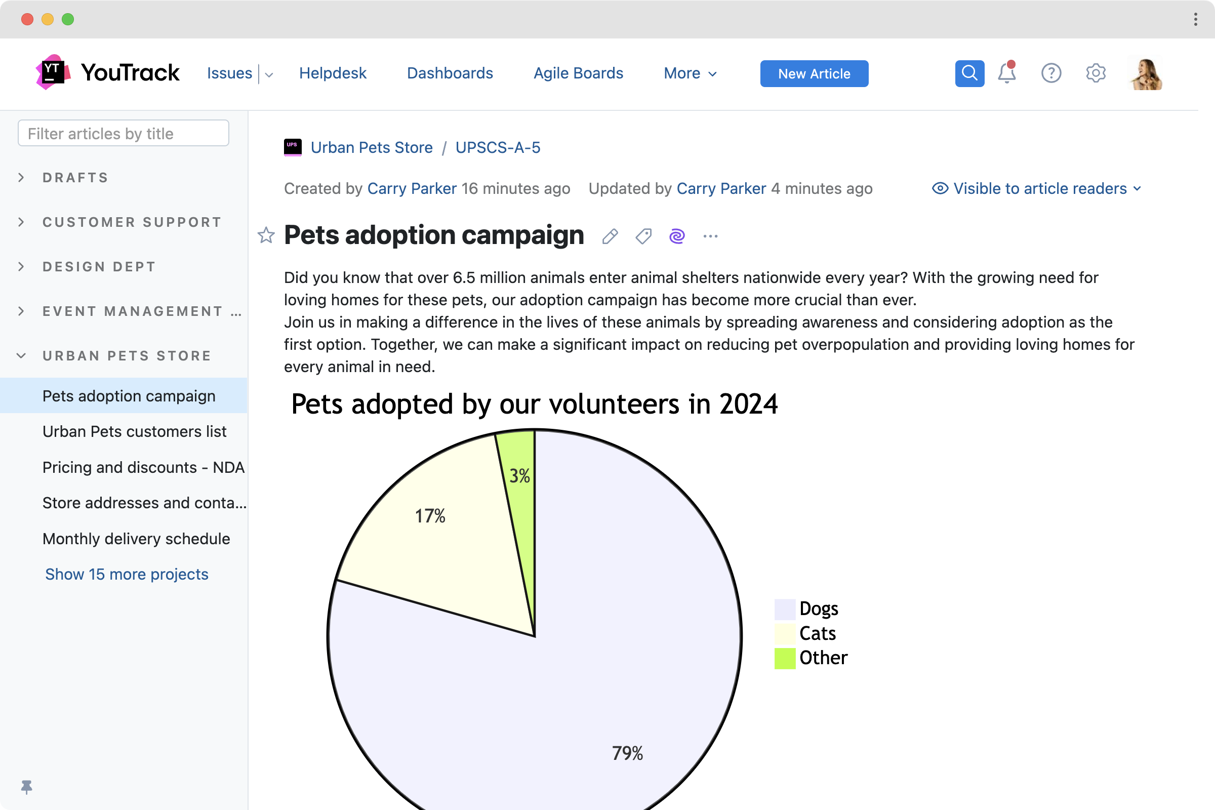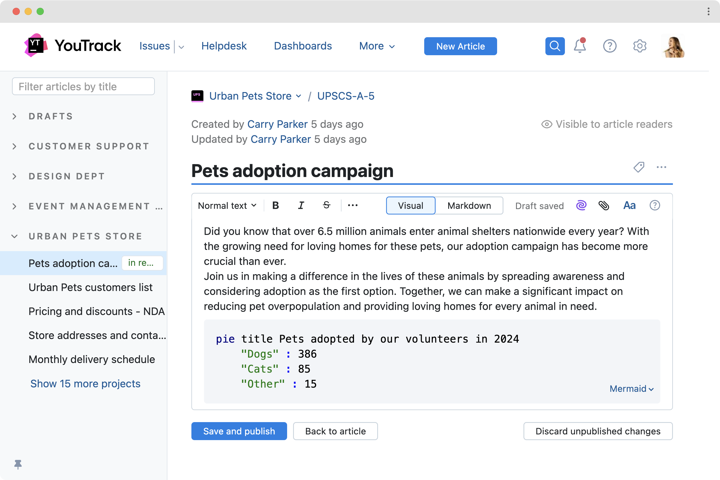 YouTrack now supports diagrams and charts created using Mermaid markup. You can add them to your tasks or articles and share them in comments – even inline comments in a Knowledge Base. Just embed a code block for the diagram and it will be rendered automatically.