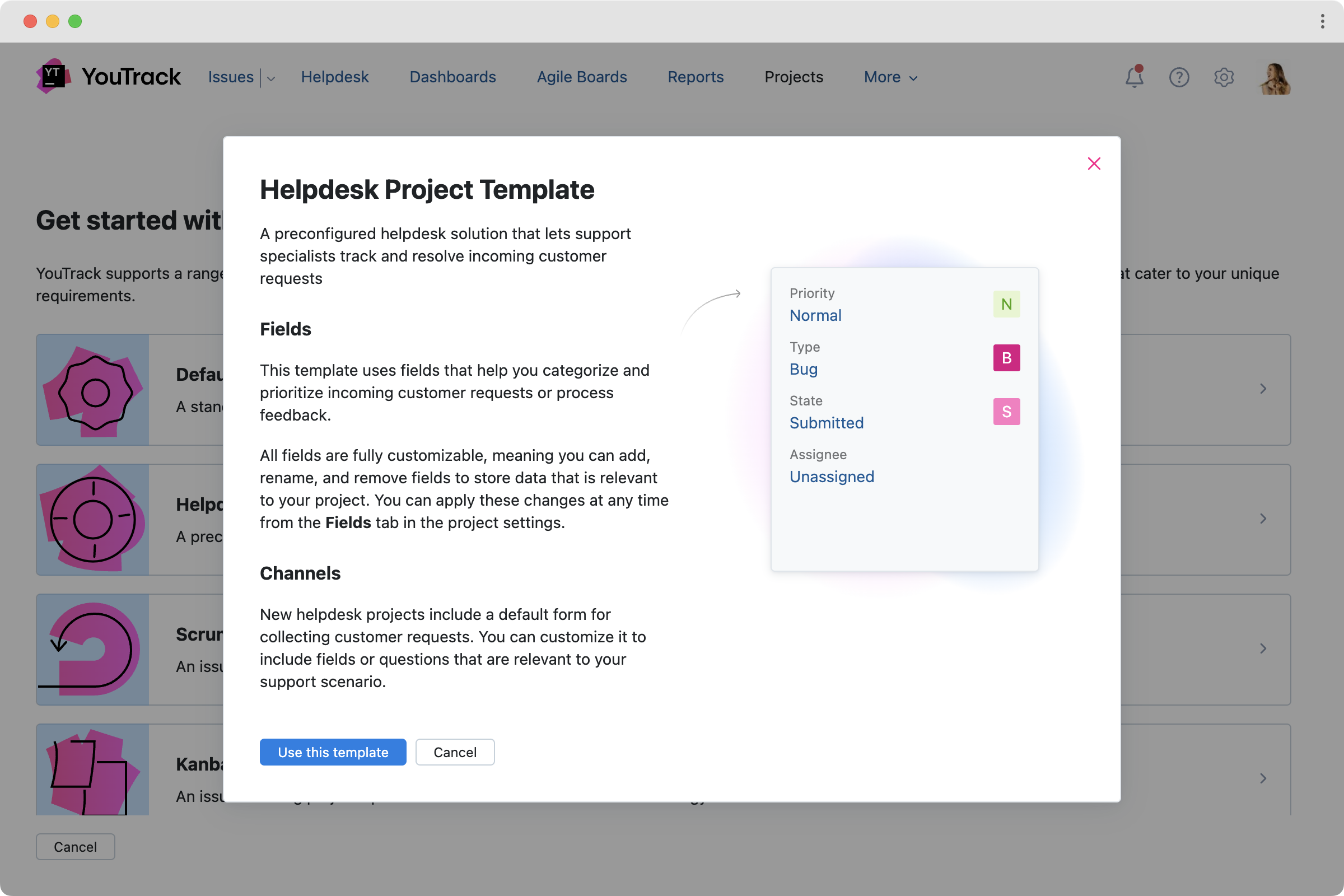 We have updated the project wizard in YouTrack to help project managers navigate through the project creation process more easily. You can choose between the templates, go through all of the steps to customize your projects and tasks according to your team needs, invite team members, and more.