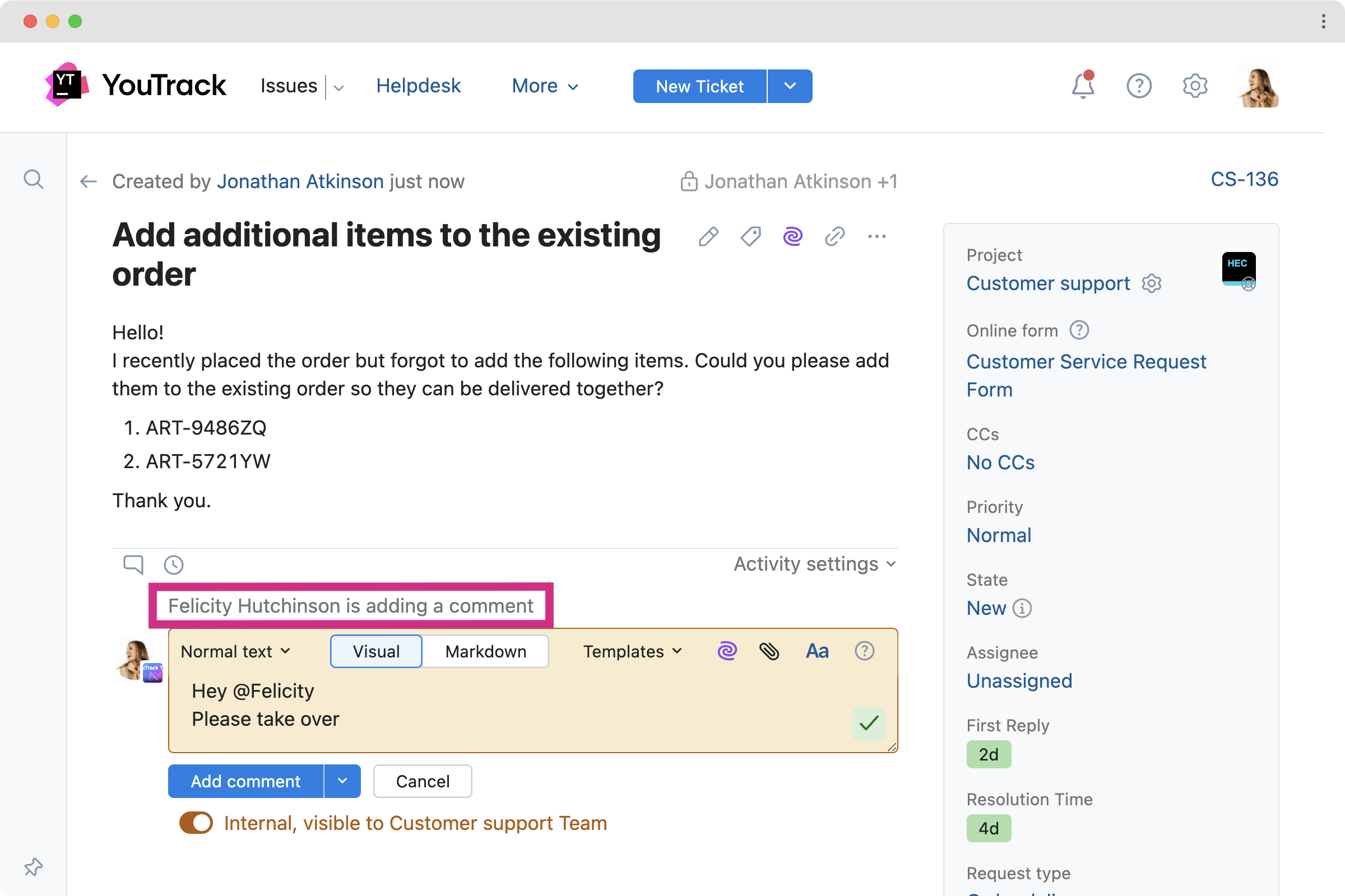 Support agents and your team members can now see when other agents or team members are in the process of adding a comment to a ticket. This helps to avoid duplicating efforts.