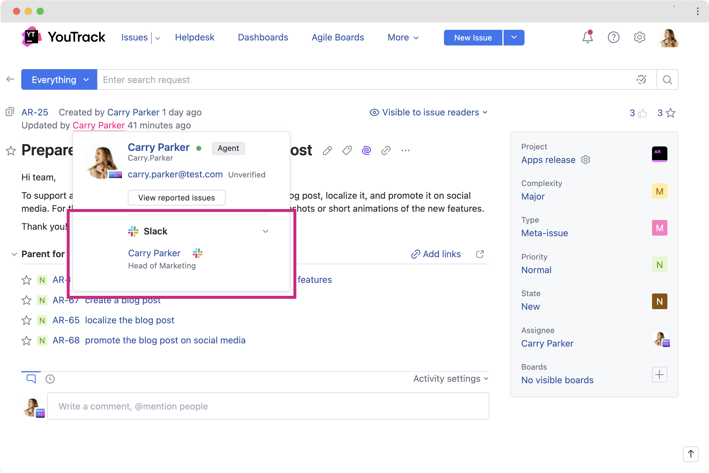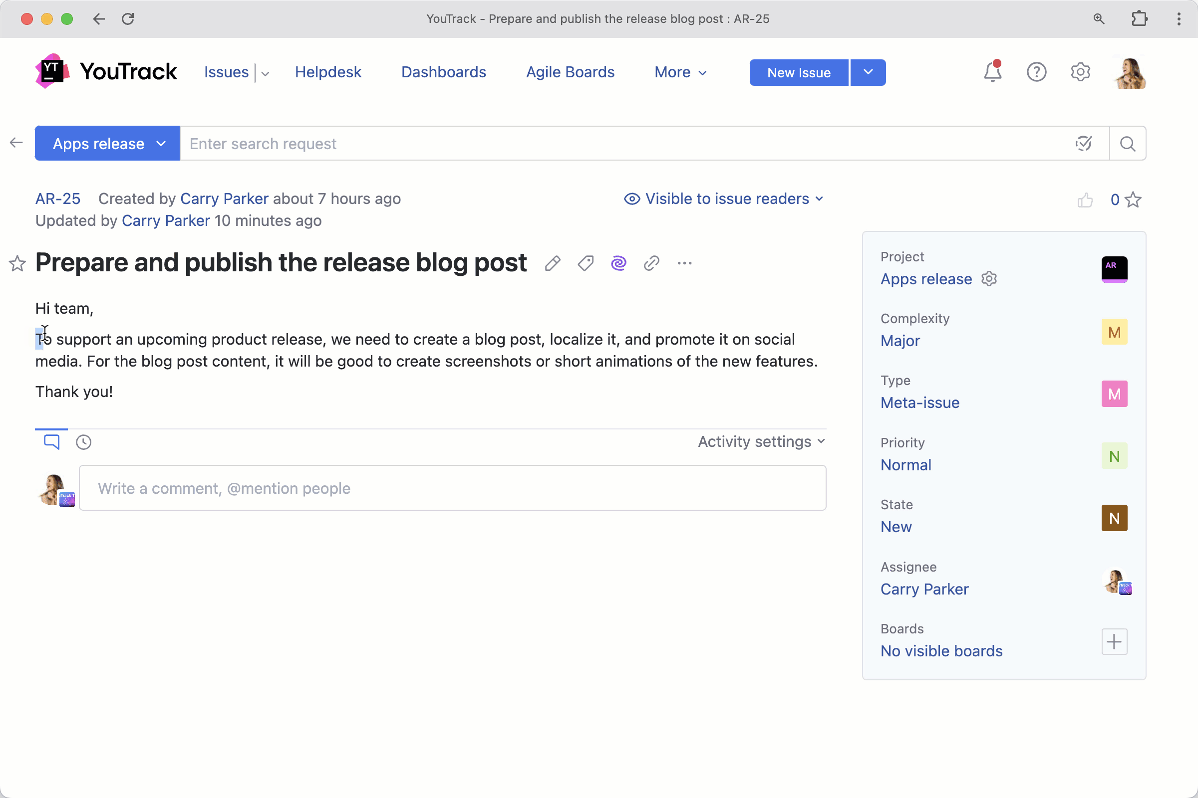With this release, you can create your own apps or install external ones to support your team's workflow. Apps in YouTrack let you customize its appearance, add UI widgets, forms, and extra pages, implement complex automation with workflows, and enhance your work experience.