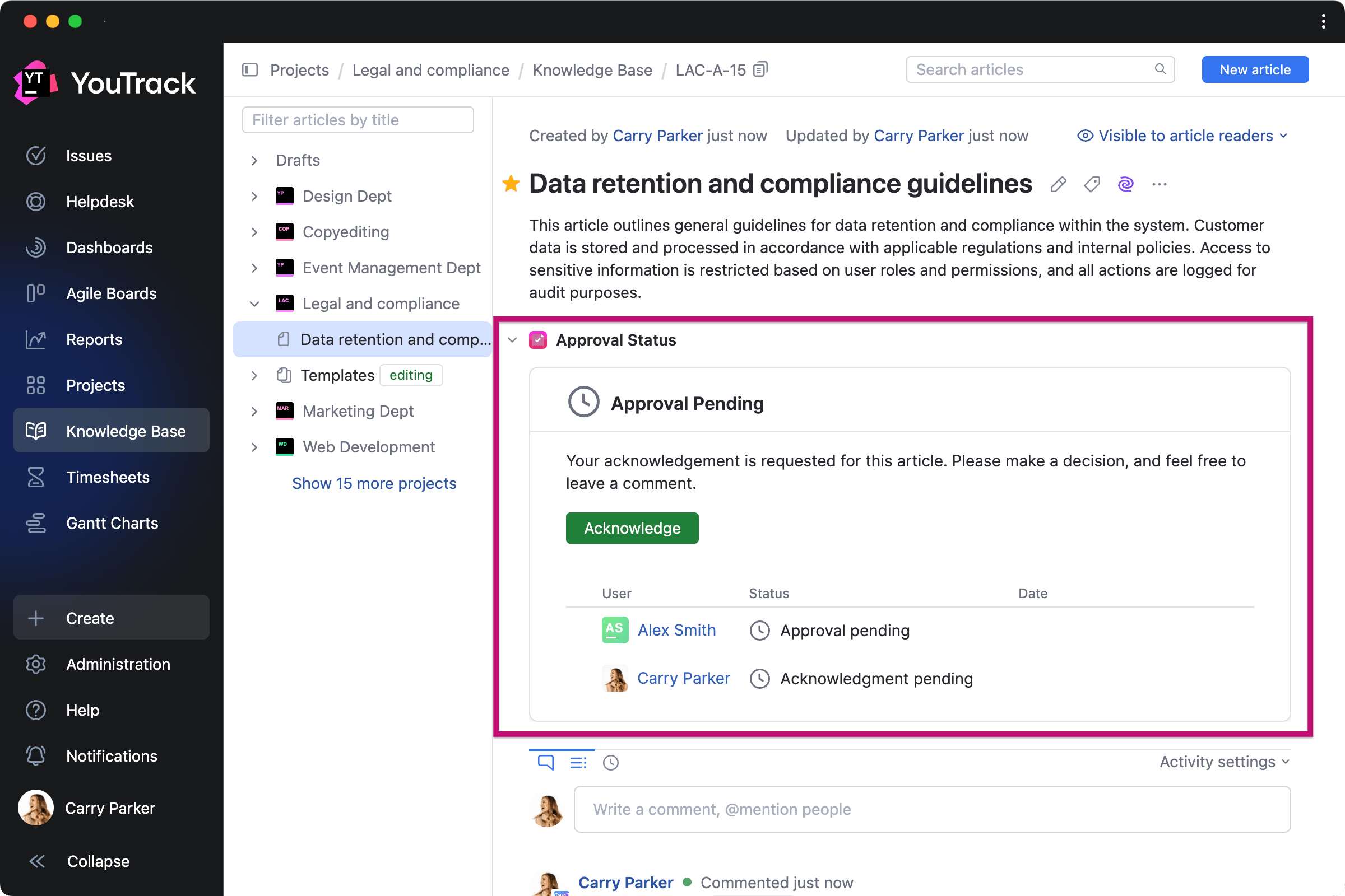 This paid app allows teams to manage approval workflows directly in the Knowledge Base. You can invite approvers and acknowledgers for each article, set due dates, and track approval statuses.