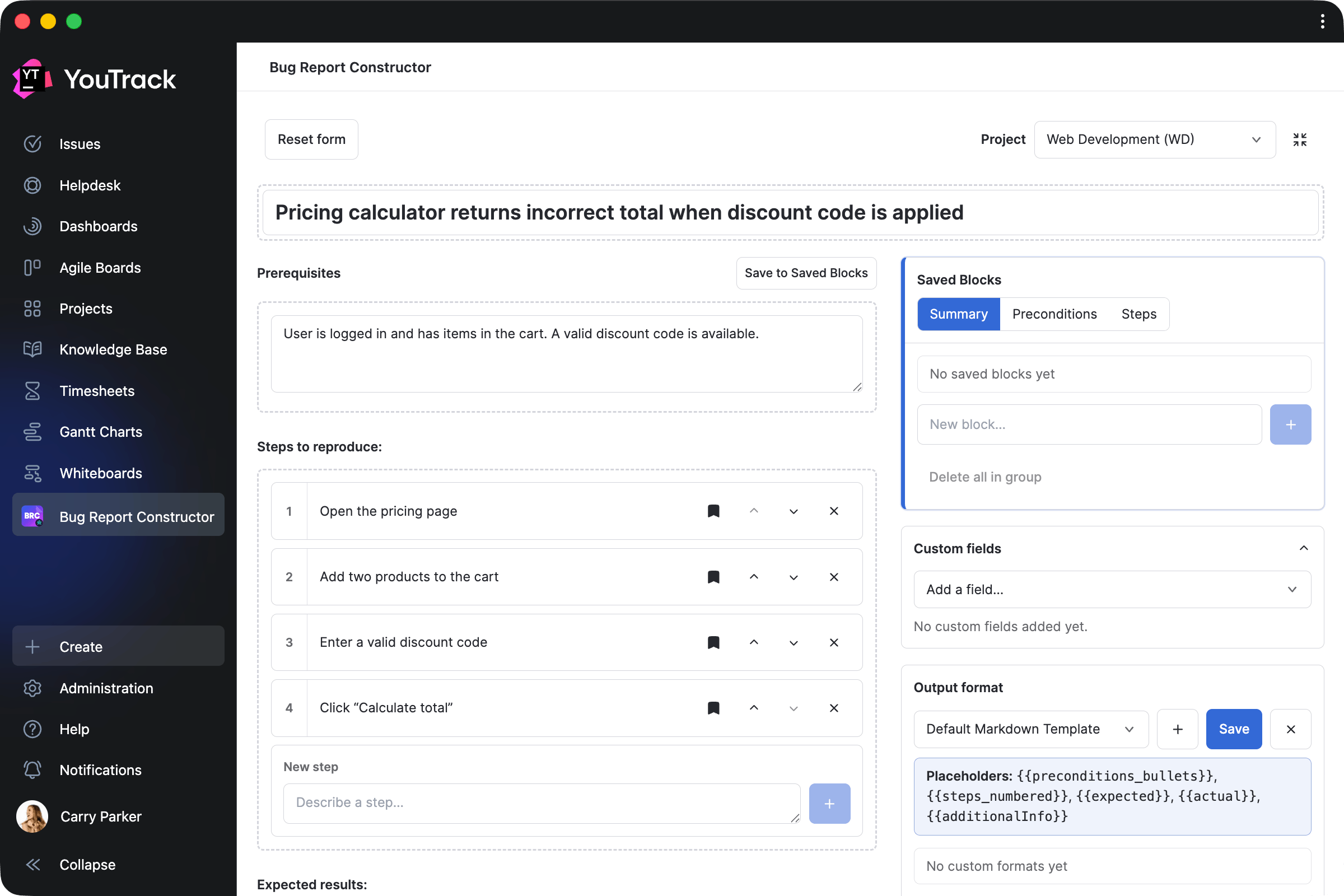 This app allows QA teams to collect bug reports using a single template and enables users to quickly create task drafts with pre-saved blocks.
