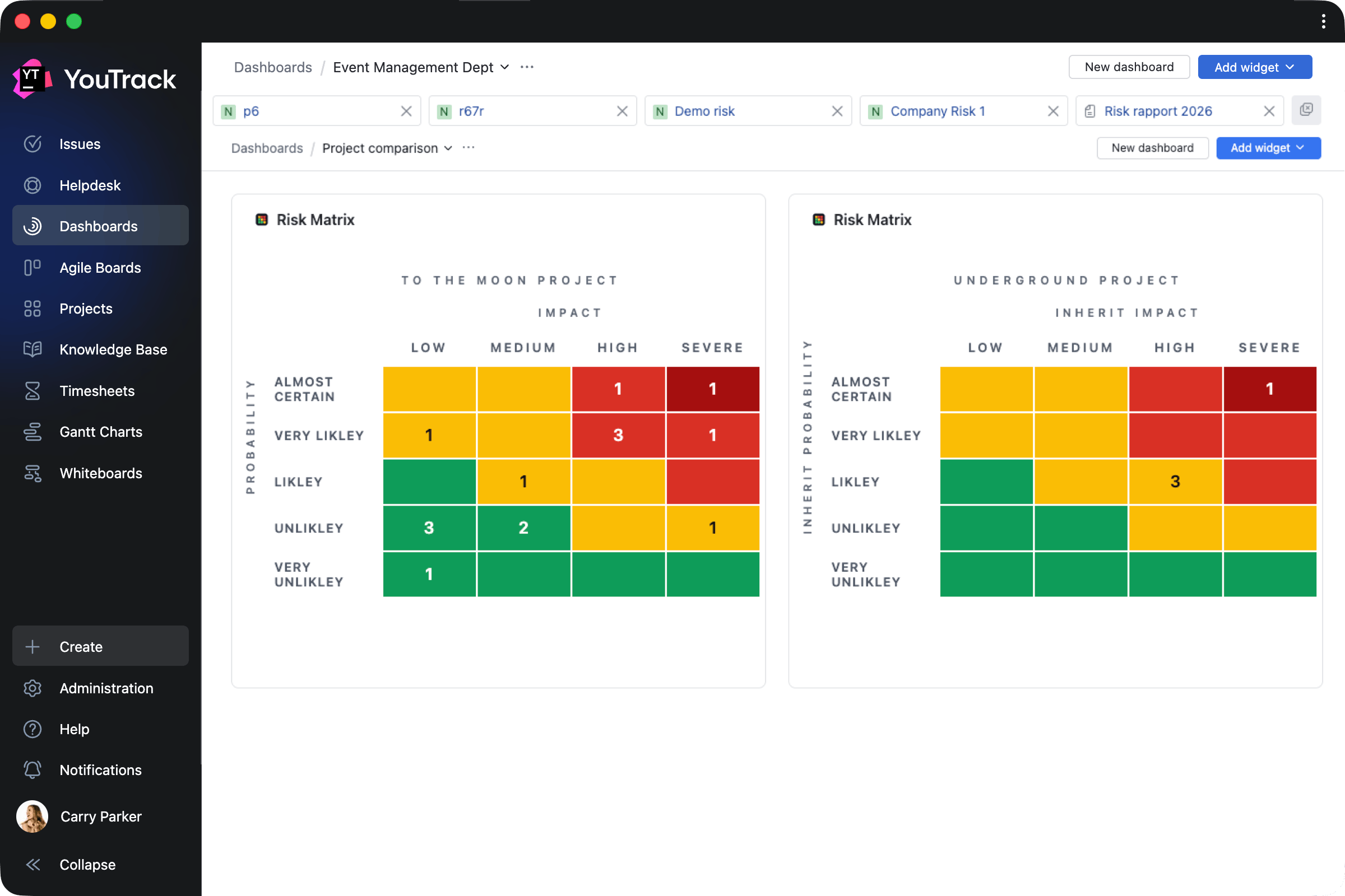 This app enables project managers to assess project risk levels by generating dynamic risk matrix widgets based on the probability and impact of task outcomes.
