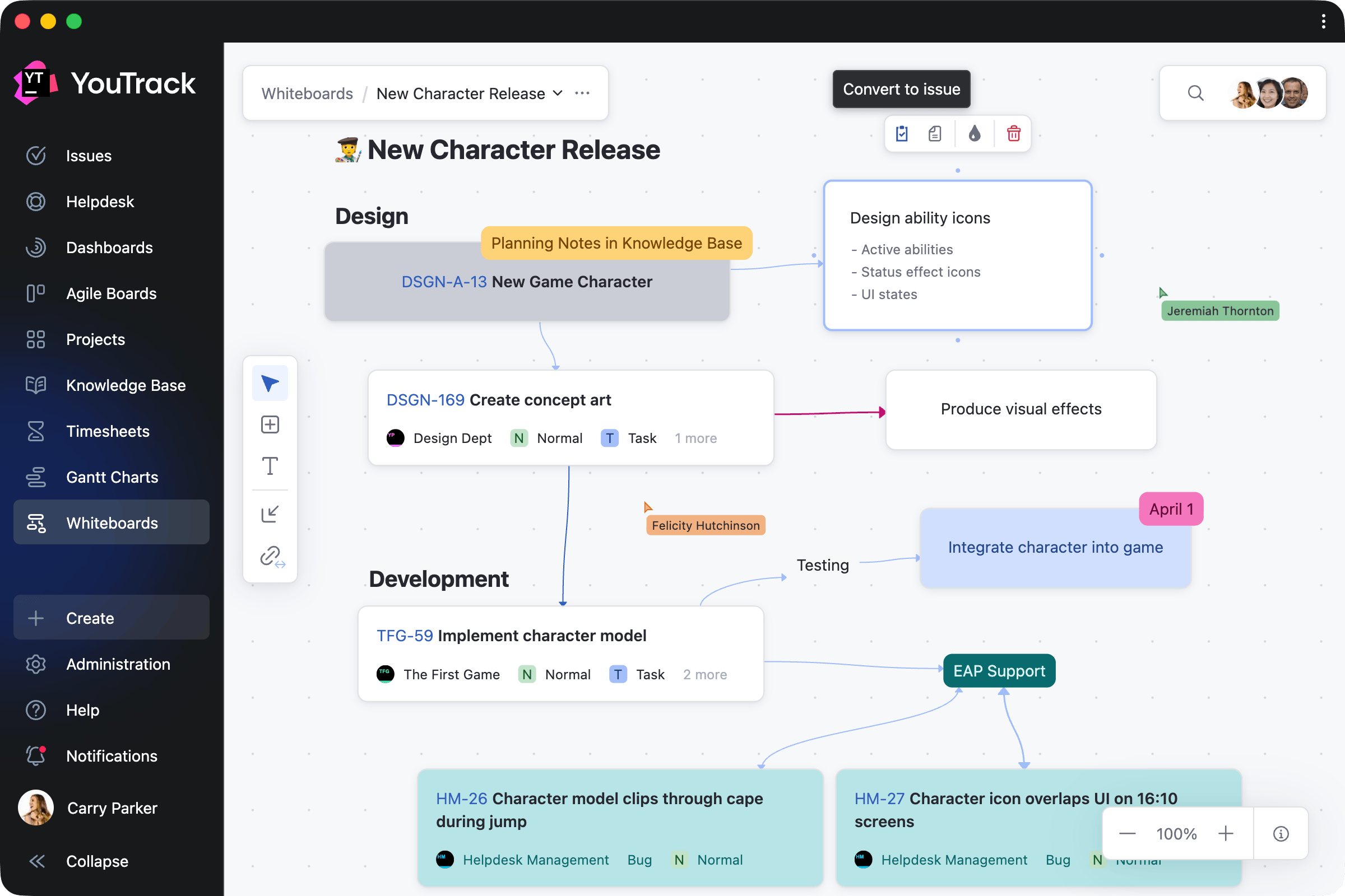 Whiteboards bring a new, flexible space for teams to plan, brainstorm, and collaborate effectively. Connect your current projects to get a better overview and organize work, or add notes and turn them into tasks and articles when you're ready. This allows project managers and teams to plan from scratch, collaborate on ongoing projects, and ensure every activity is linked to your work in YouTrack.