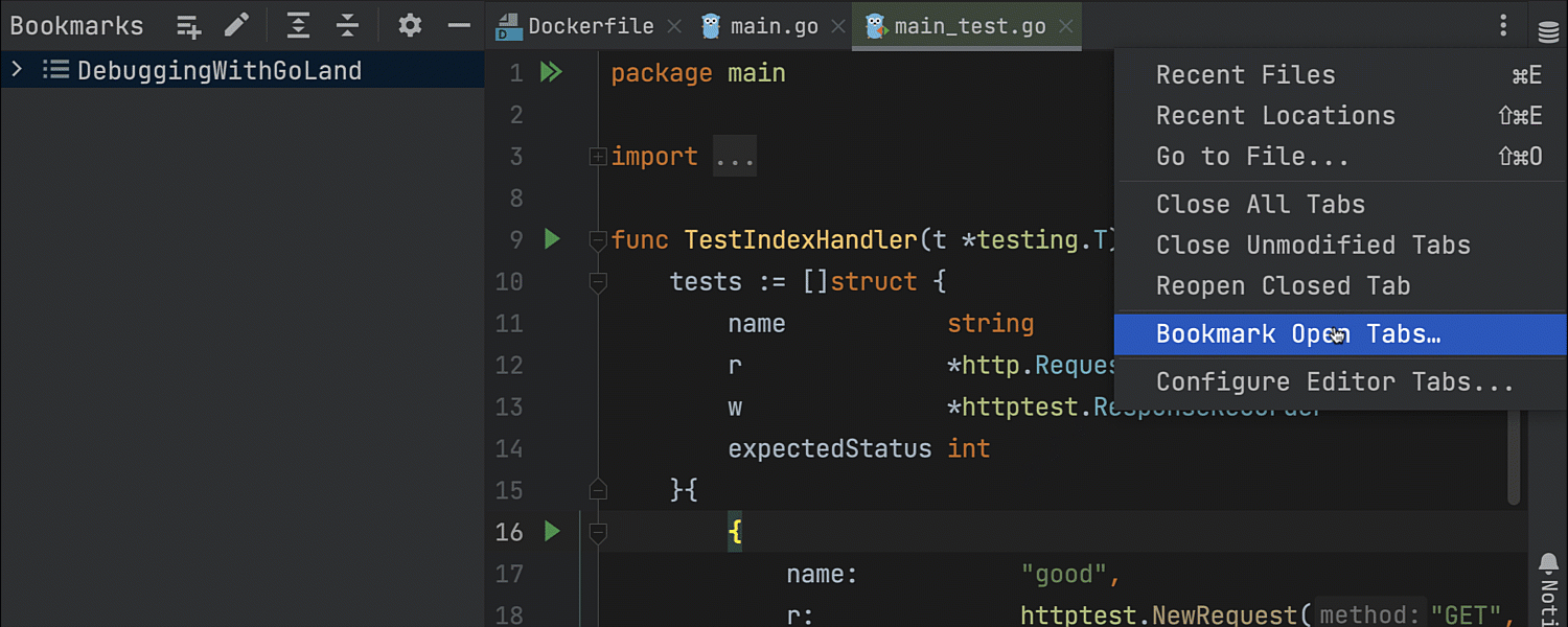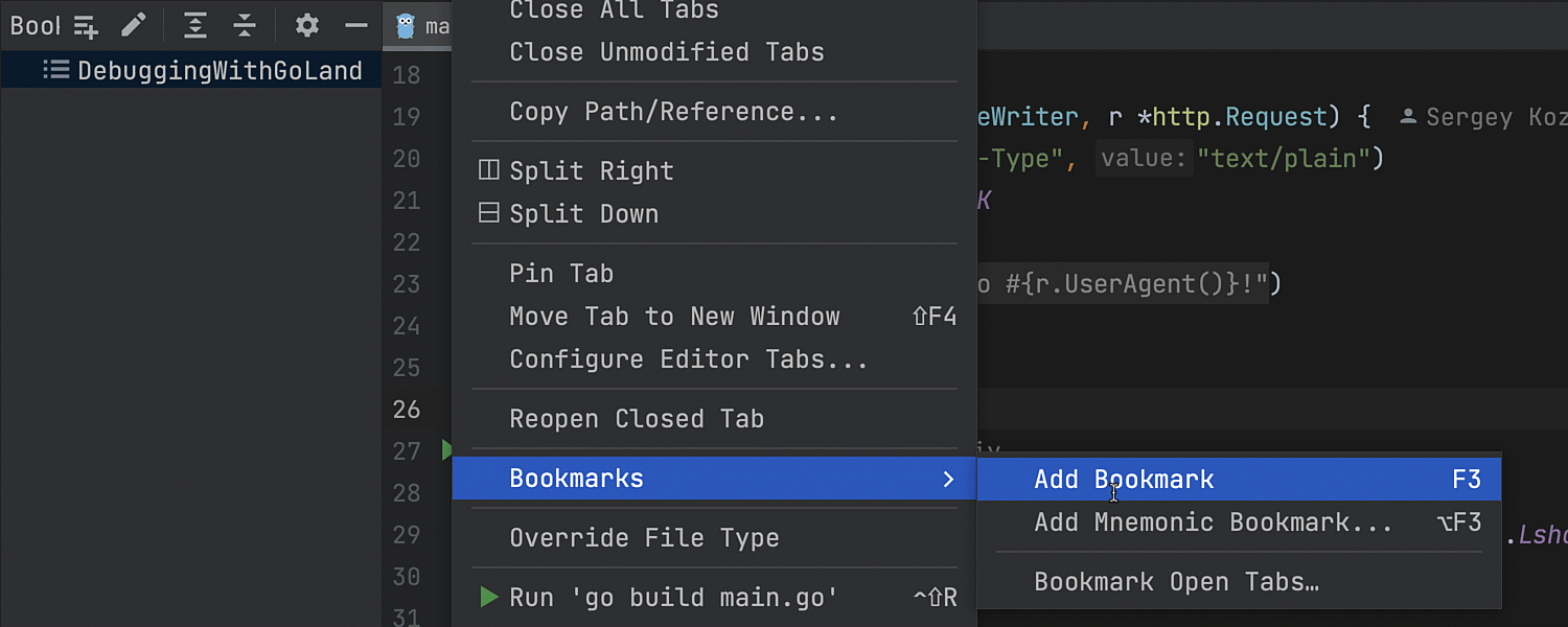 现在,又可以从编辑器标签页中为文件添加书签了。 只需右键点击标签页调用上下文菜单并选择 Bookmarks(书签)。