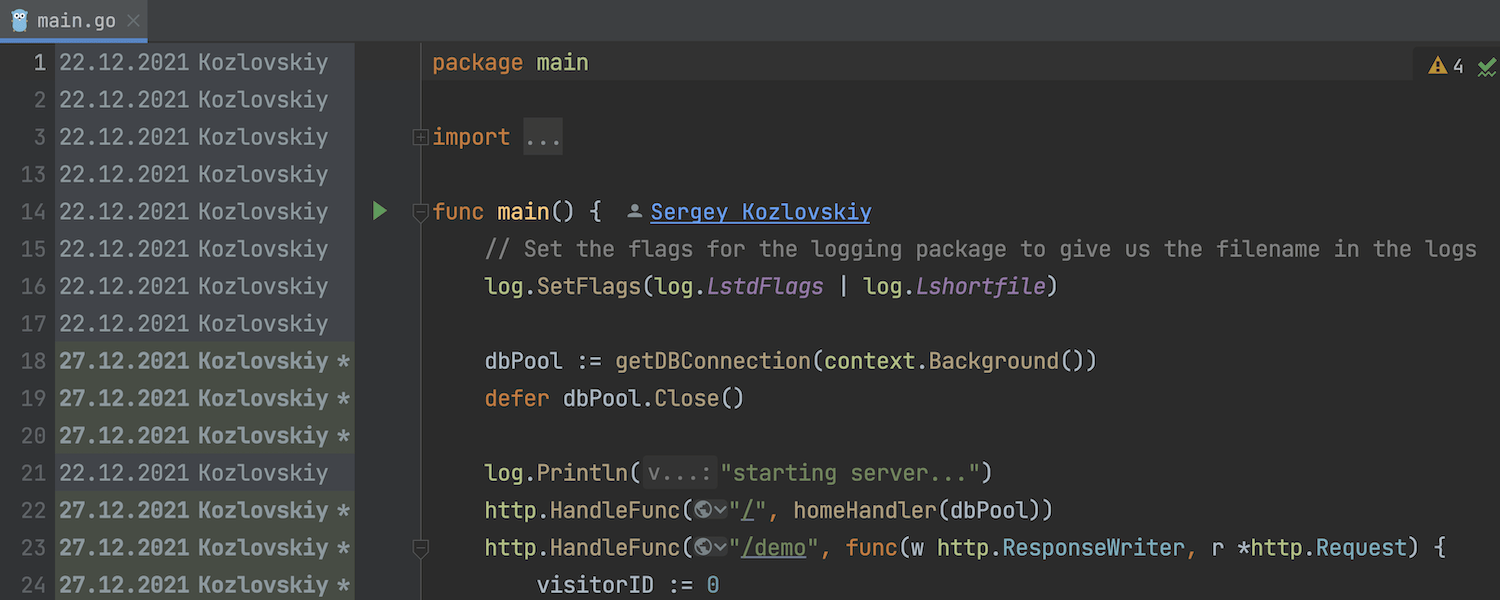 我们已经开始实现 Code Vision 功能。 目前,启用版本控制集成后会显示代码作者。 点击代码作者姓名将打开 Annotate with Git blame(使用 Git 追溯注解)边栏,显示是谁引入了更改。