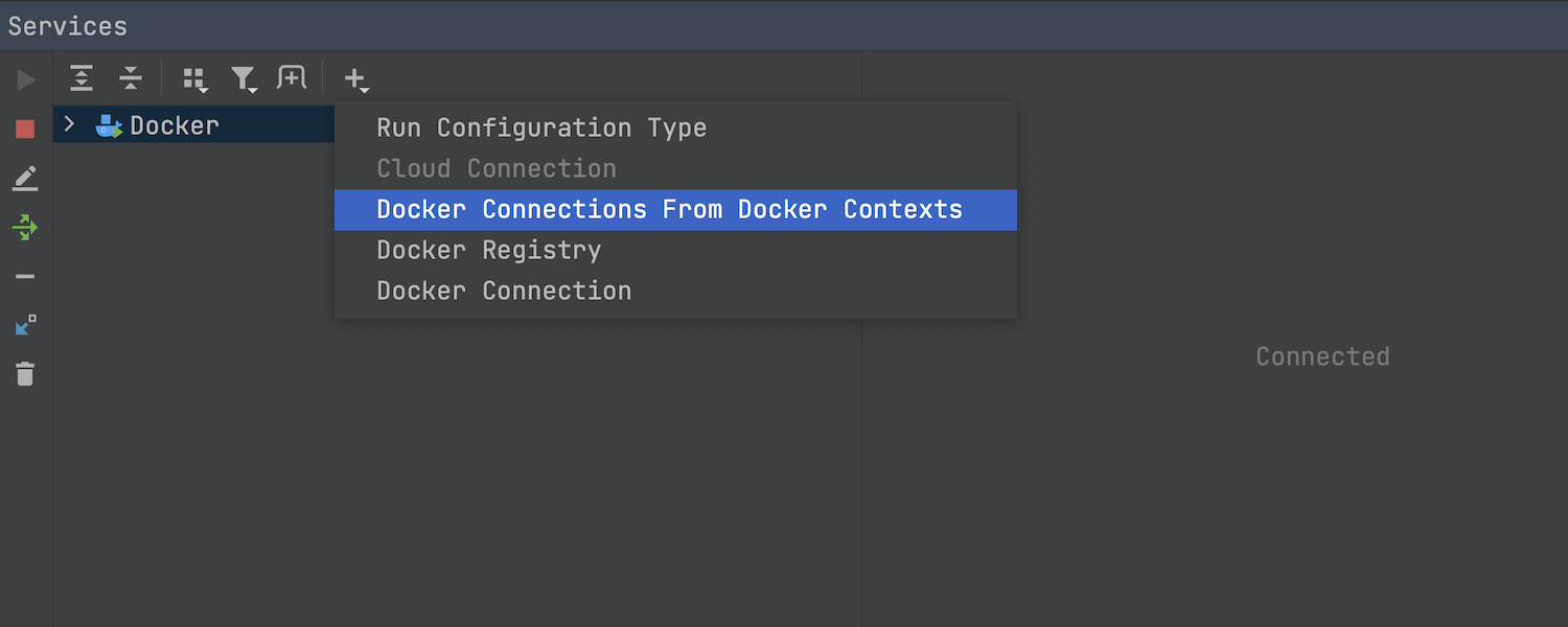 如果 Docker 配置中已有这些设置,您现在可以使用 Docker 上下文设置额外的 Docker 连接。 为此,您可以在 Services(服务)视图中调用 Add Service(添加服务)上下文菜单并选择 Docker Connections From Docker Contexts(来自 Docker 上下文的 Docker 连接)。