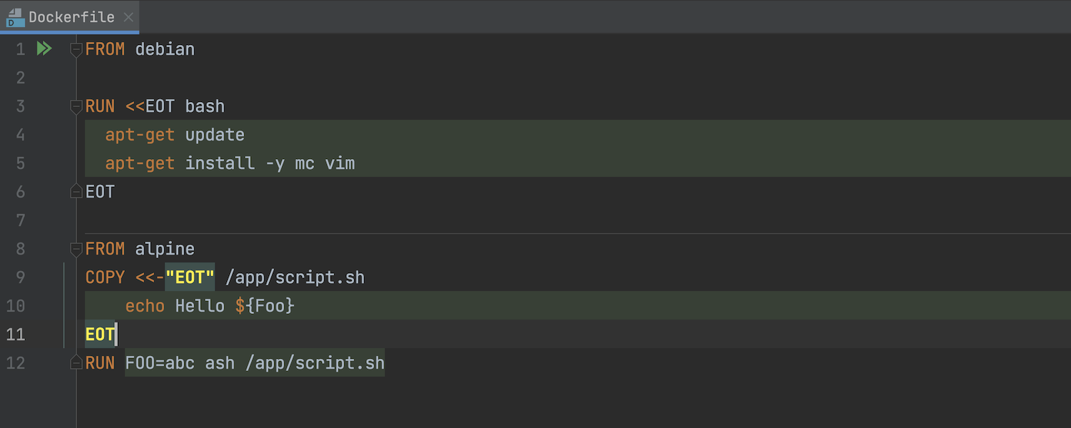 Here 文档允许将后续 Dockerfile 行重定向到 RUN 或 COPY 命令的输入。 GoLand 现在支持此语法,您可以使用它在 Dockerfile 文件中生成配置文件或多行脚本。