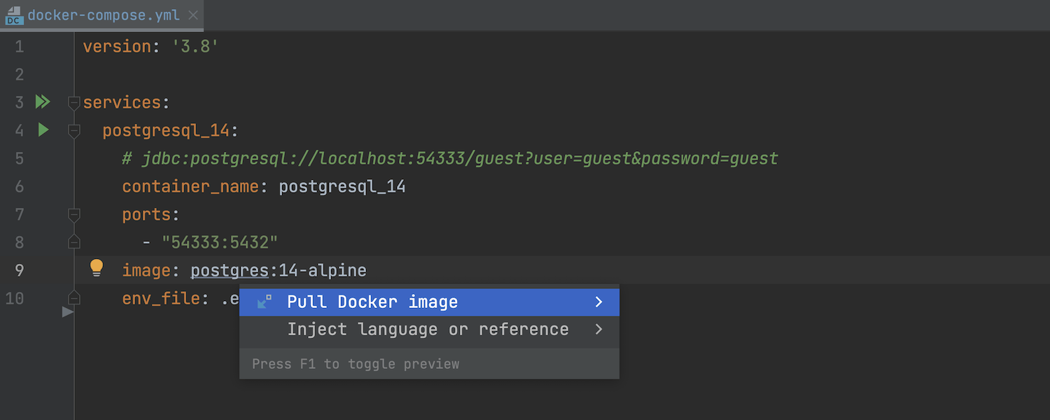 现在,有一种无需从 Dockerfile 或 docker-compose.yml 运行即可拉取镜像的简单方式。 为此,在高亮显示的镜像名称上调用上下文操作 (Alt+Enter),然后选择 Pull Docker image(拉取 Docker 镜像)。