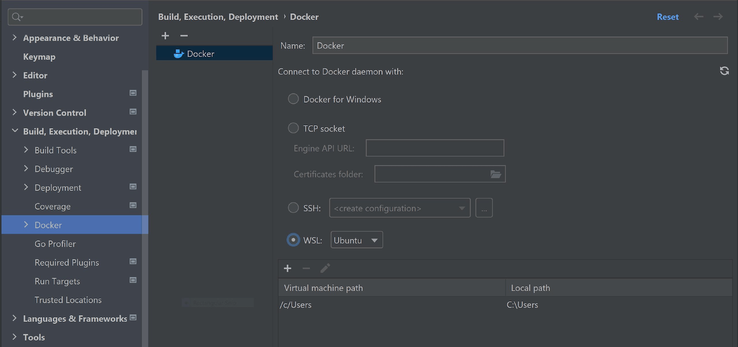 GoLand 现在支持连接到在适用于 Linux 的 Windows 子系统 (WSL) 中运行的 Docker。 您可以在 Settings | Build, Execution, Deployment | Docker(设置 | 构建、执行、部署 | Docker)中设置连接。