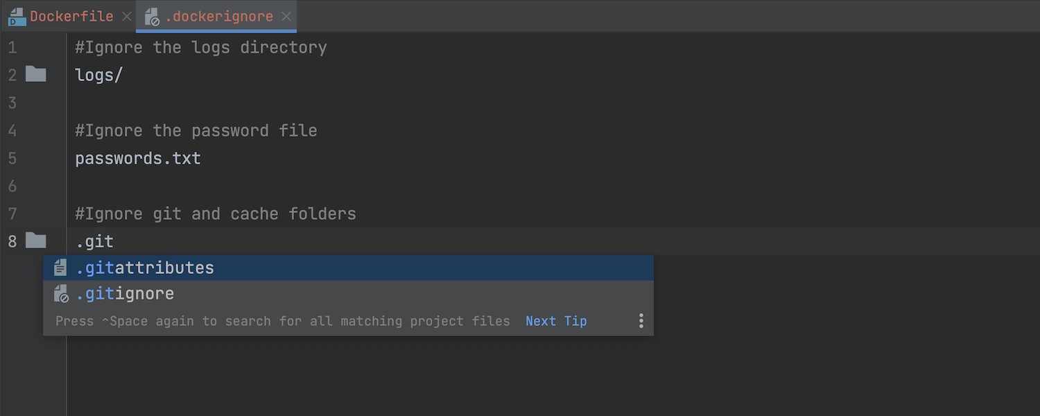 .dockerignore 文件类型支持我们引入了对 .dockerignore 文件的全面支持,包括代码高亮显示和补全。 从 IDE 构建镜像时,这些文件会被纳入考量。