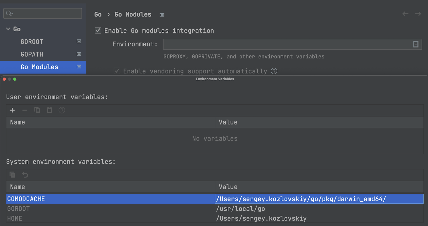 GoLand 现在会自动获取 Go 模块相关系统变量,并将其显示在 Environment variables(环境变量)对话框窗口中。 要打开此窗口,请转至 Settings | Go | Go Modules(设置 | Go | Go 模块),点击 Edit environment variables(编辑环境变量)图标。
