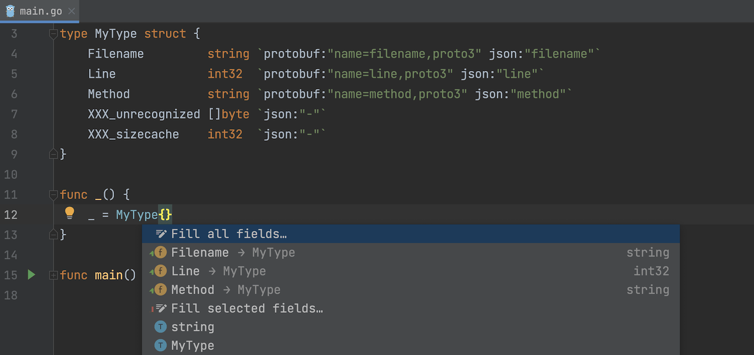 调用 Fill all fields(填充所有字段)意图操作时,IDE 会忽略以 XXX_ 开头的自动生成的协议缓冲区字段。 这些字段仅在第二次调用补全后显示。