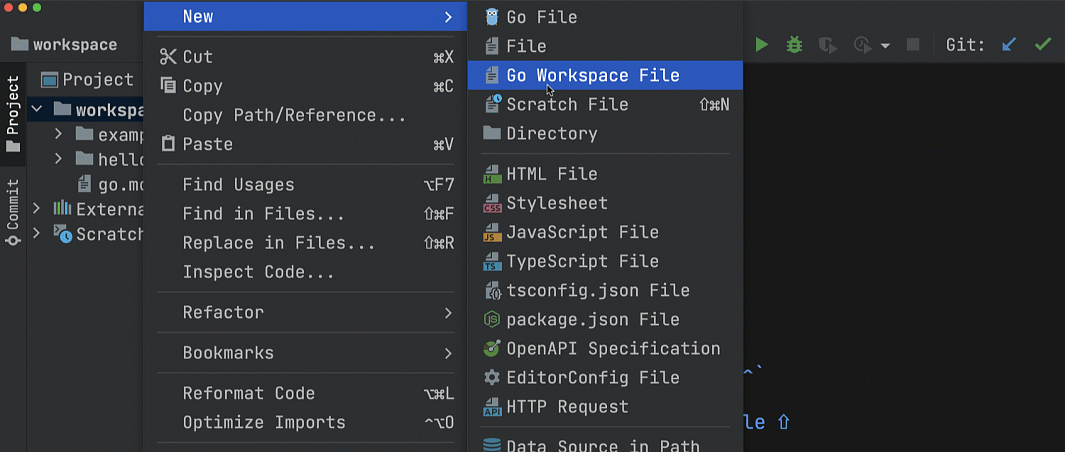 在 New(新建)上下文菜单中,您现在会找到 Go Workspace File(Go 工作区文件)操作。 选择时,根文件夹中将出现一个 go.work 文件。 现有 Go 模块将自动添加到 go.work 文件中。