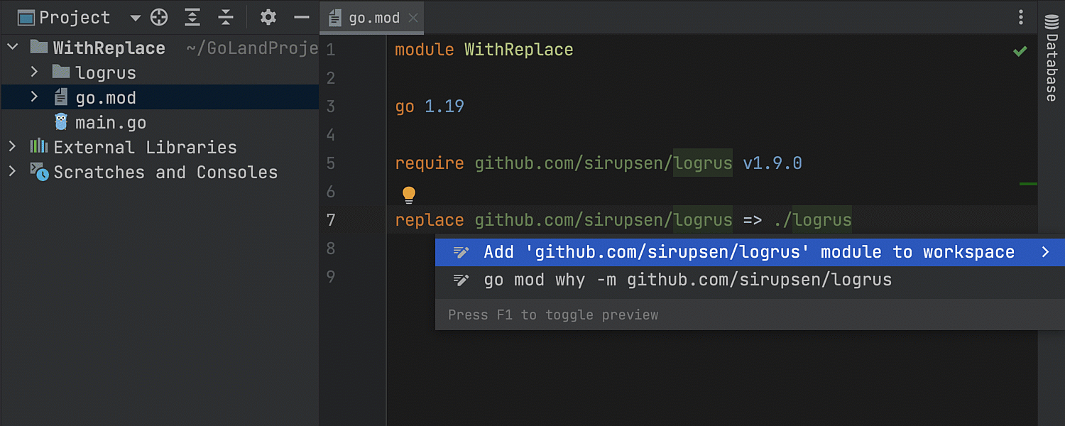 replace 指令生成 go.work 如果有 replace 指令,您现在可以从 go.mod 生成 go.work。 将文本光标置于 replace 指令上,按 Alt+Enter 查看所有可用意图操作,然后选择 Add … module to workspace…(将 … 模块添加到工作区)快速修复。