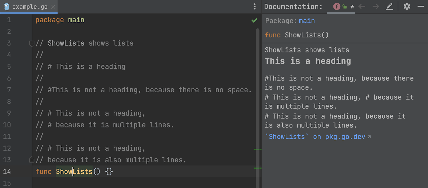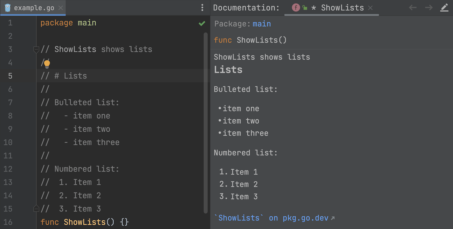 Go 1.19 在文档注释中添加了对链接、列表和新标题的支持。 GoLand 2022.3 也支持这些新功能。
