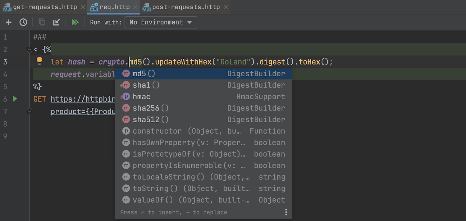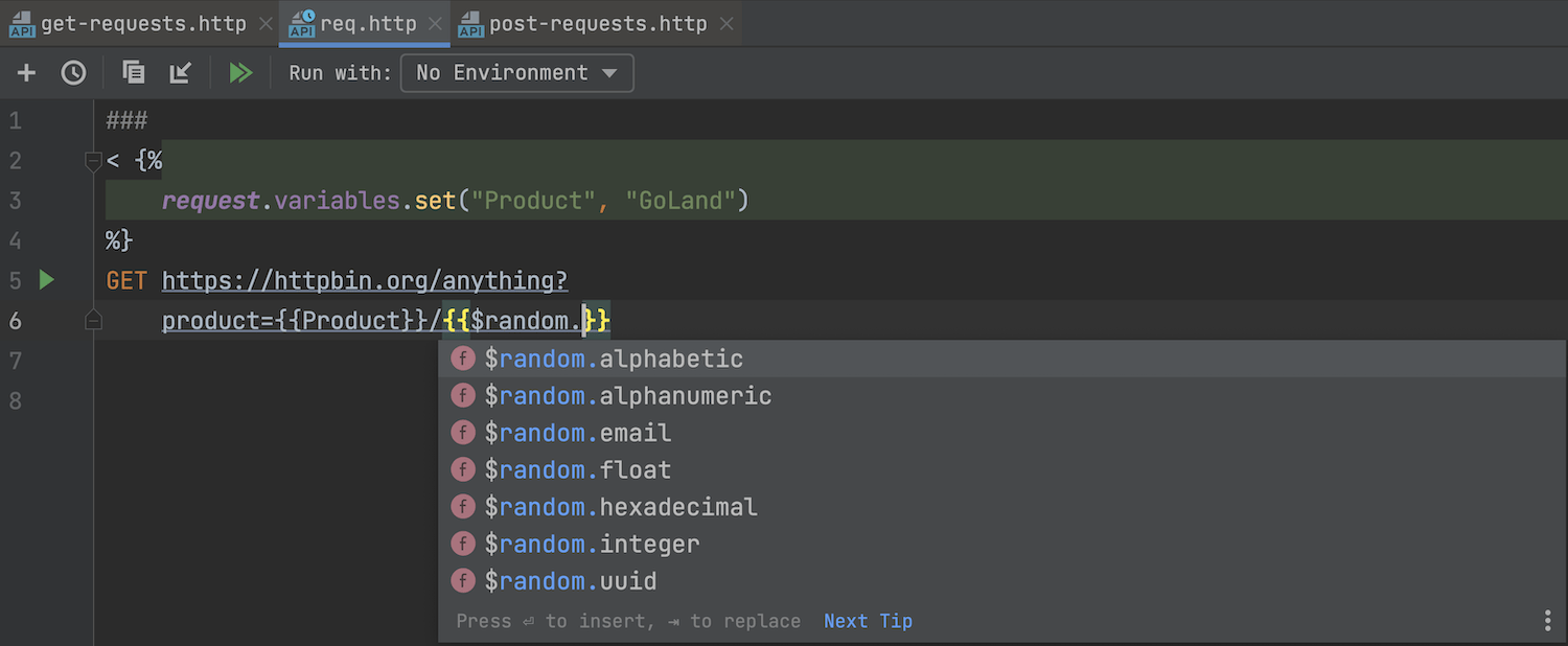 HTTP 客户端现在支持在请求之前执行脚本块。 您可以在执行请求之前生成数据,并使用变量将其放入最终请求。 可以使用快速修复创建用于初始化变量的样板代码。