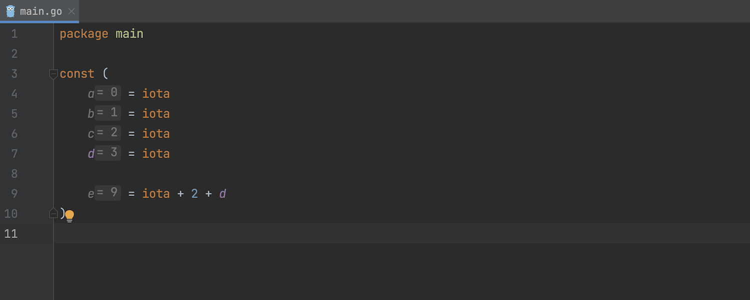 GoLand 现在会显示常量定义块的嵌入提示。 这在 iota 派生的常量块中特别实用,其中提示显示了与每个位置关联的 iota 值。