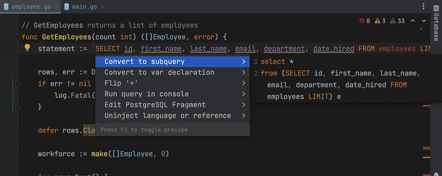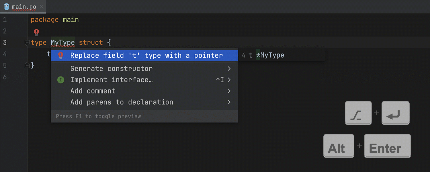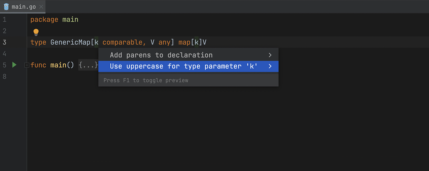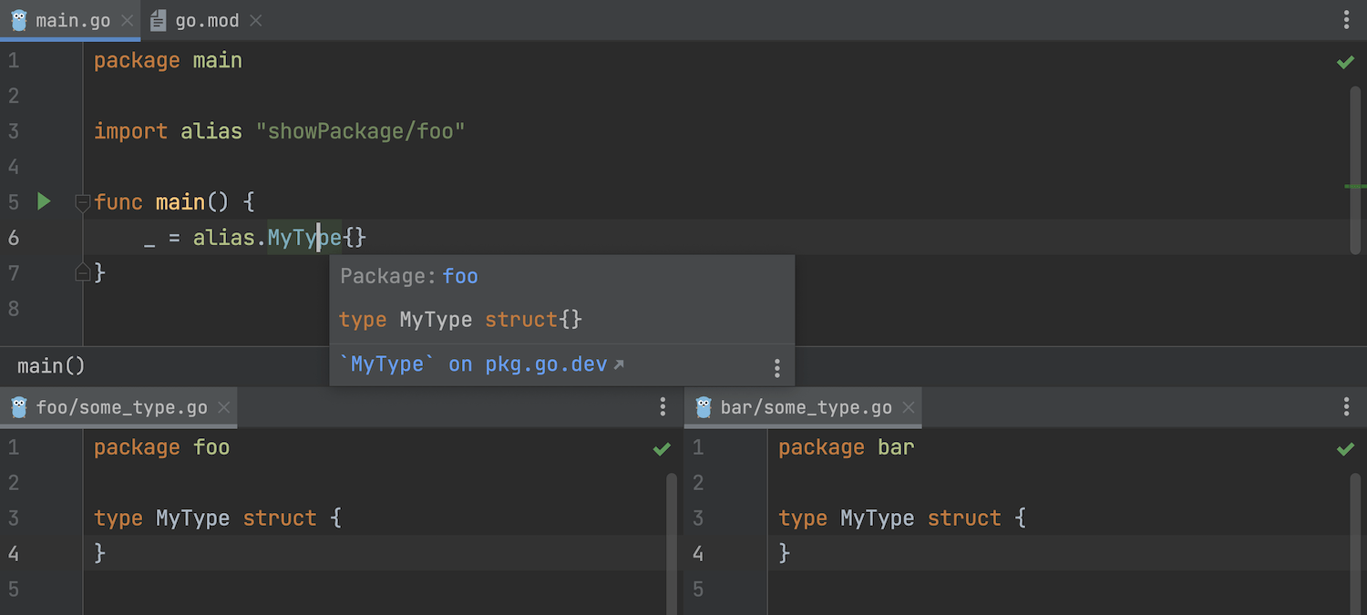 IDE 现在始终在顶层声明的 Quick documentation(快速文档)弹出窗口中显示软件包名称。 此前,只有在找到 doc.go 或 <pkg_name>.go 文件时才会显示软件包头。