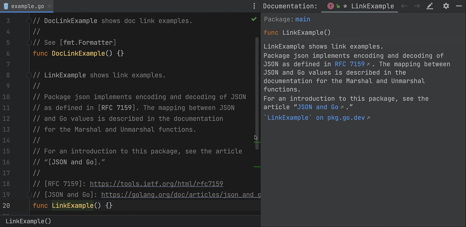 我们在 GoLand 中添加了对文档链接的引用。 点击它们可以前往引用的元素,点击文本链接会前往文本链接定义。