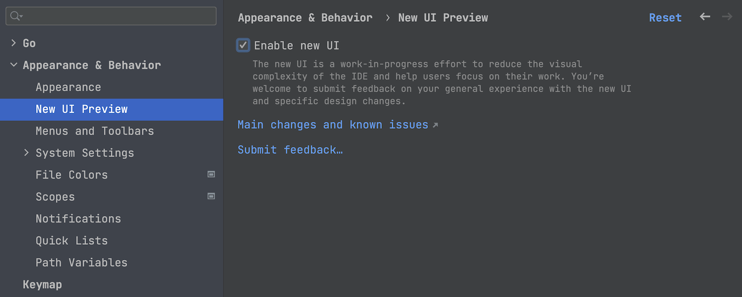 我们邀请您在 Settings | Appearance & Behavior | New UI Preview(设置 | 外观与行为 | 新 UI 预览)中切换到新 UI。尝试一下,并与我们分享您的看法。