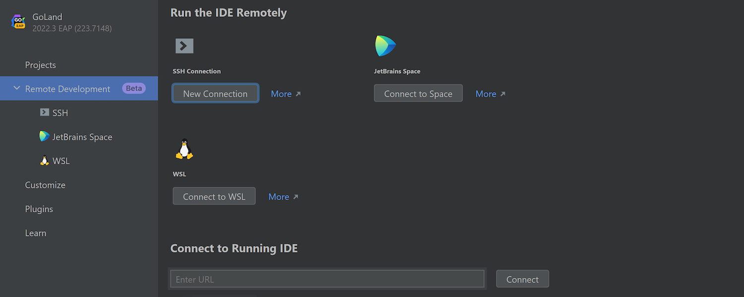 IDE 后端现在可以直接在 WSL 2 中启动,并且您可以像在 GoLand 中使用远程开发时连接到远程机器一样连接到它。