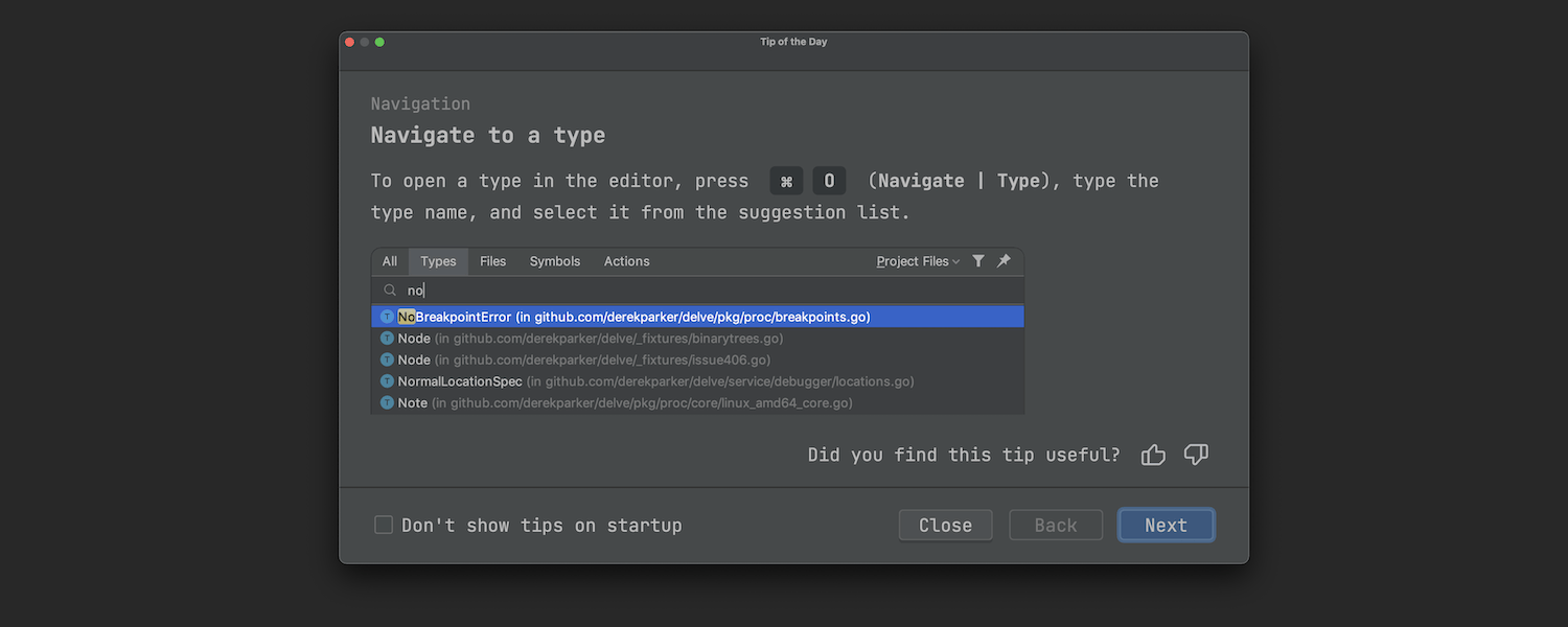 我们增强了 Tips of the Day(每日小技巧)功能,这是一种帮助您探索 GoLand 的学习工具。