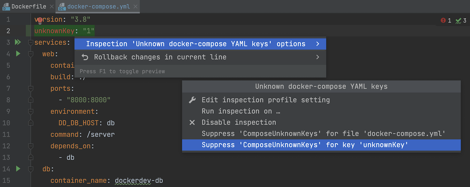 在 YAML 文件(包括 Kubernetes 文件、OpenAPI 规范和 docker-compose.yml 文件)中,新增的快速修复可以通过注释禁止检查。