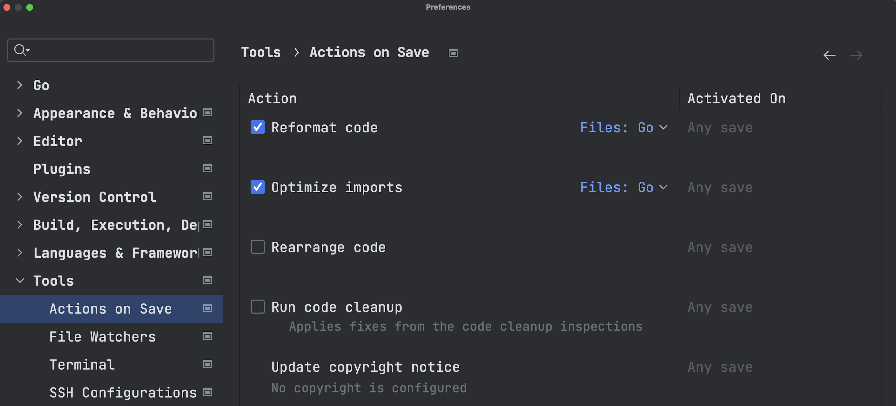 转到 File | New Projects Setup | Preferences For New Projects | Tools | Actions on Save(文件 | 新项目设置 | 新项目偏好设置 | 工具 | 保存时的操作),选择在项目中保存更改时要触发的操作。
