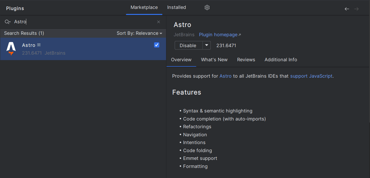 Astro 支持已登陆 GoLand。 您可以从 Settings | Plugins(设置 | 插件)安装新增的 Astro 插件。 插件提供基本功能,包括语法高亮显示、带自动导入的代码补全、重构、导航、正确的格式设置等。