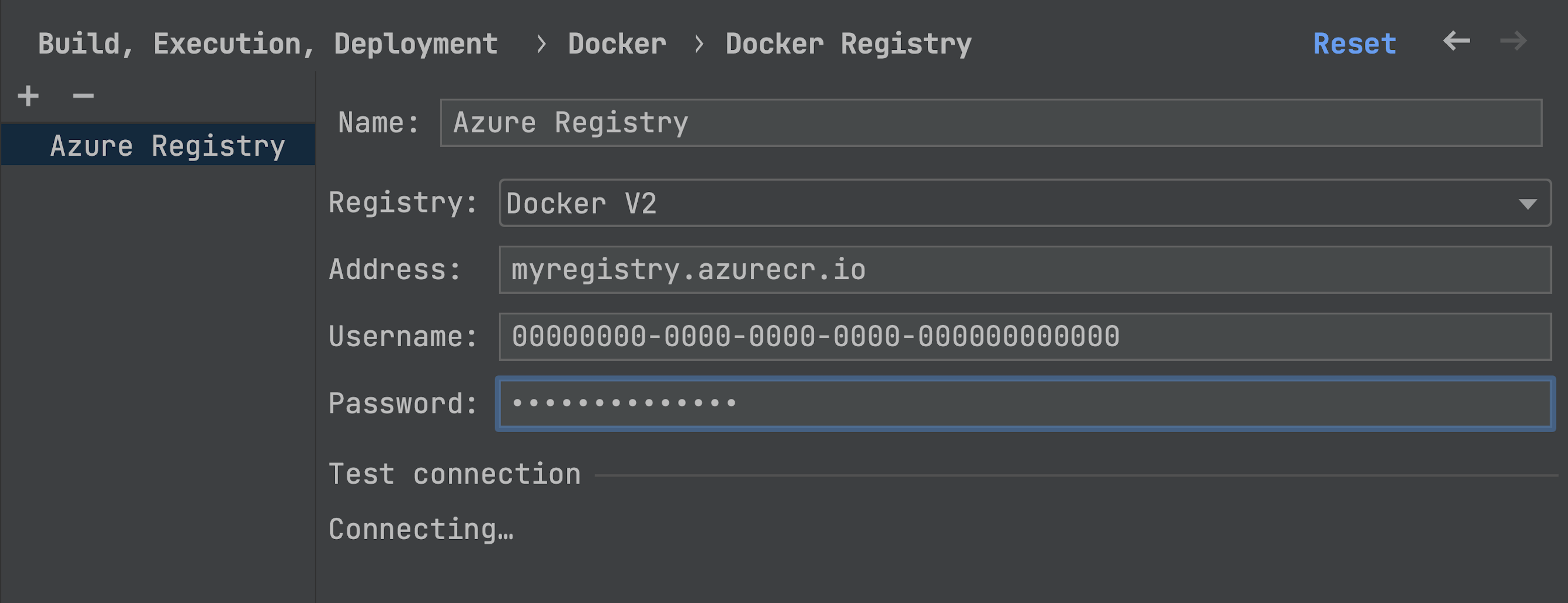 您现在可以轻松连接到 Azure 容器注册表。 转到 Settings | Build, Execution, Deployment | Docker | Docker Registry(设置 | 构建、执行、部署 | Docker | Docker 注册表),在 Registry(注册表)输入字段中选择 Docker V2 选项进行设置。
