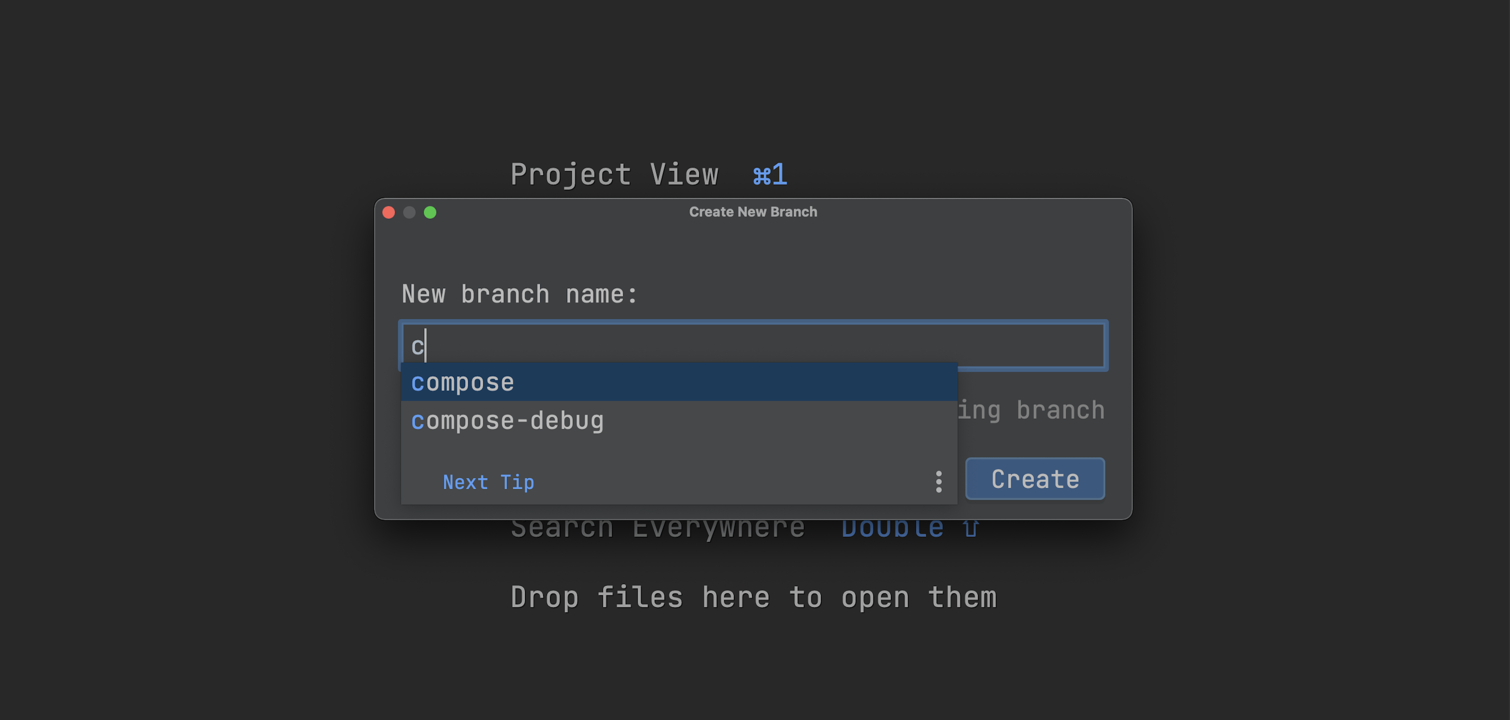我们在 Create New Branch(创建新分支)弹出窗口中实现了补全。 按 Ctrl+空格,IDE 将根据现有本地分支的名称建议相关前缀。