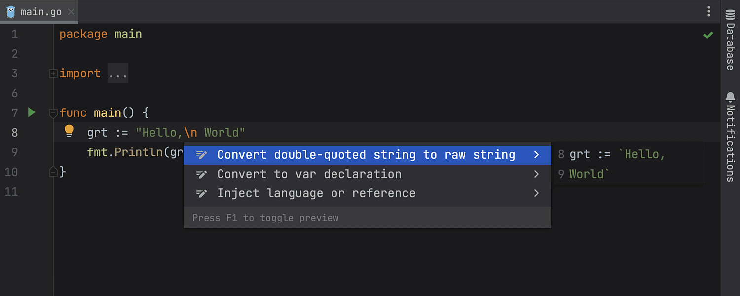 现在,可以通过一个意图操作在原始字符串字面量(由反引号包围的字符串)与其带双引号的形式之间快速转换。