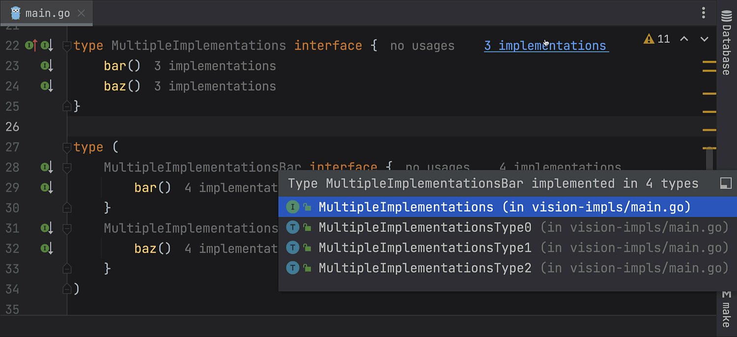 我们更新了 Code Vision 功能。 GoLand 现在会显示接口的实现数量及其方法规范。