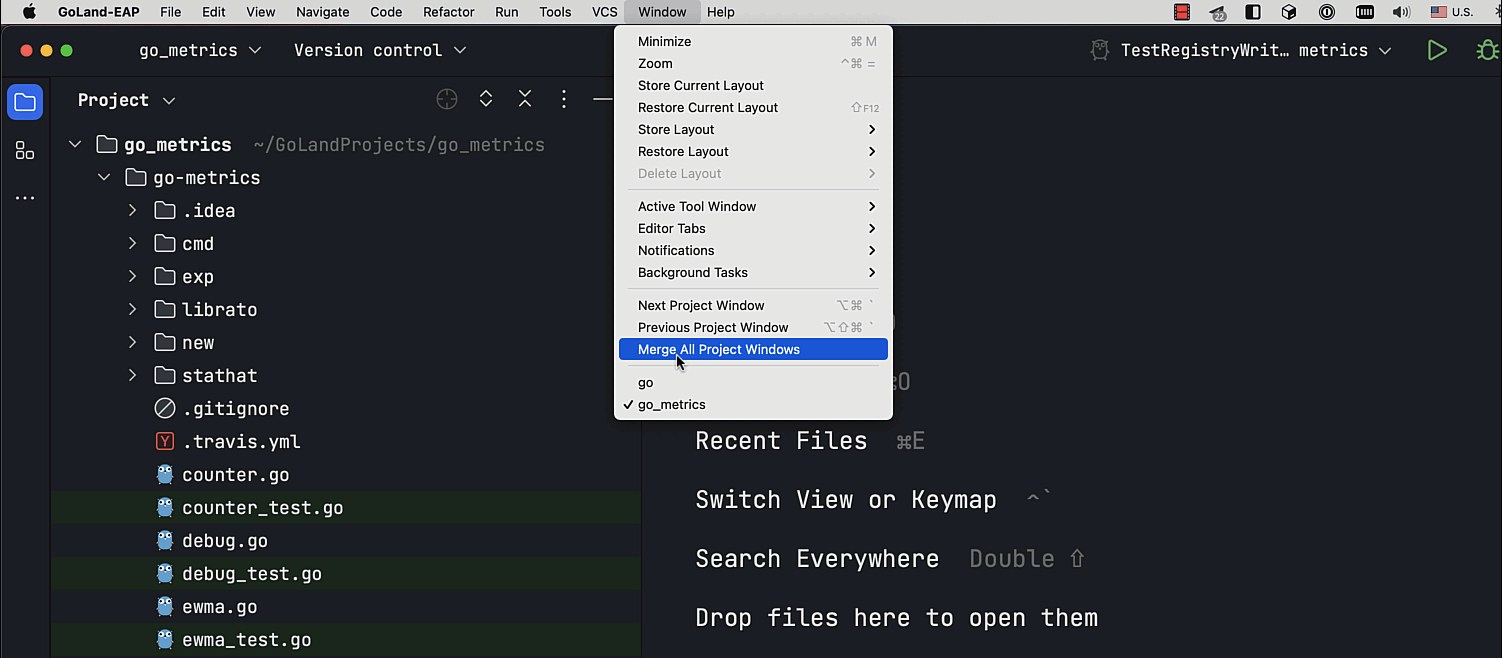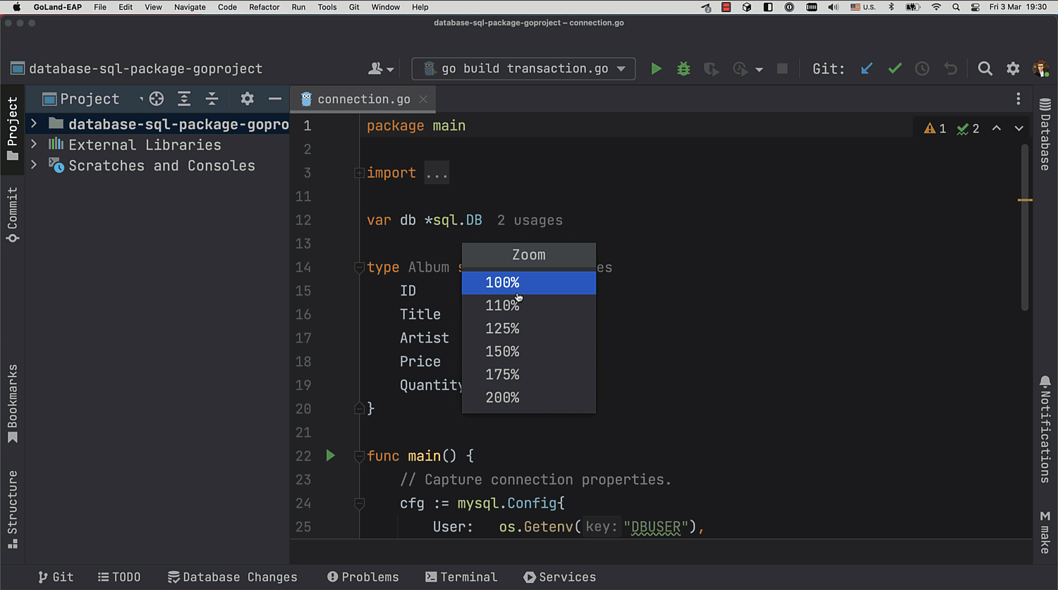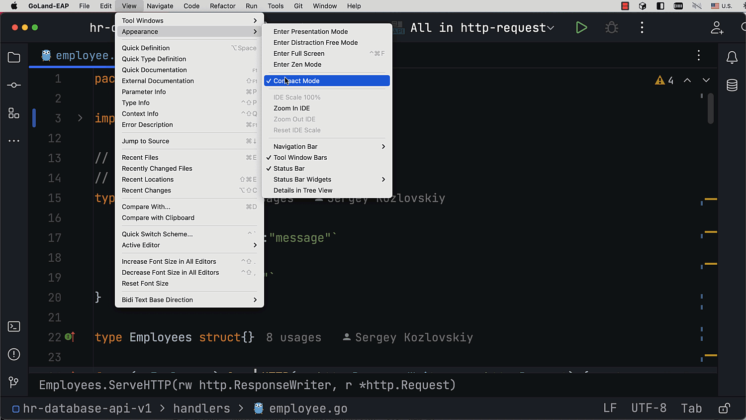 现在可以完全放大和缩小 GoLand,同时增加或缩减所有 UI 元素的大小。 从主菜单中,选择 View | Appearance | Switch Zoom IDE(视图 | 外观 | 切换缩放 IDE),调整 IDE 的缩放比例。