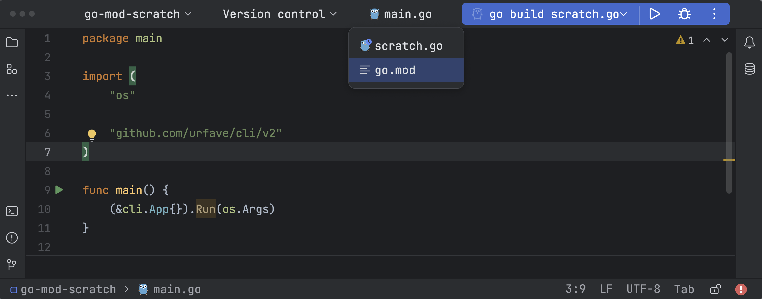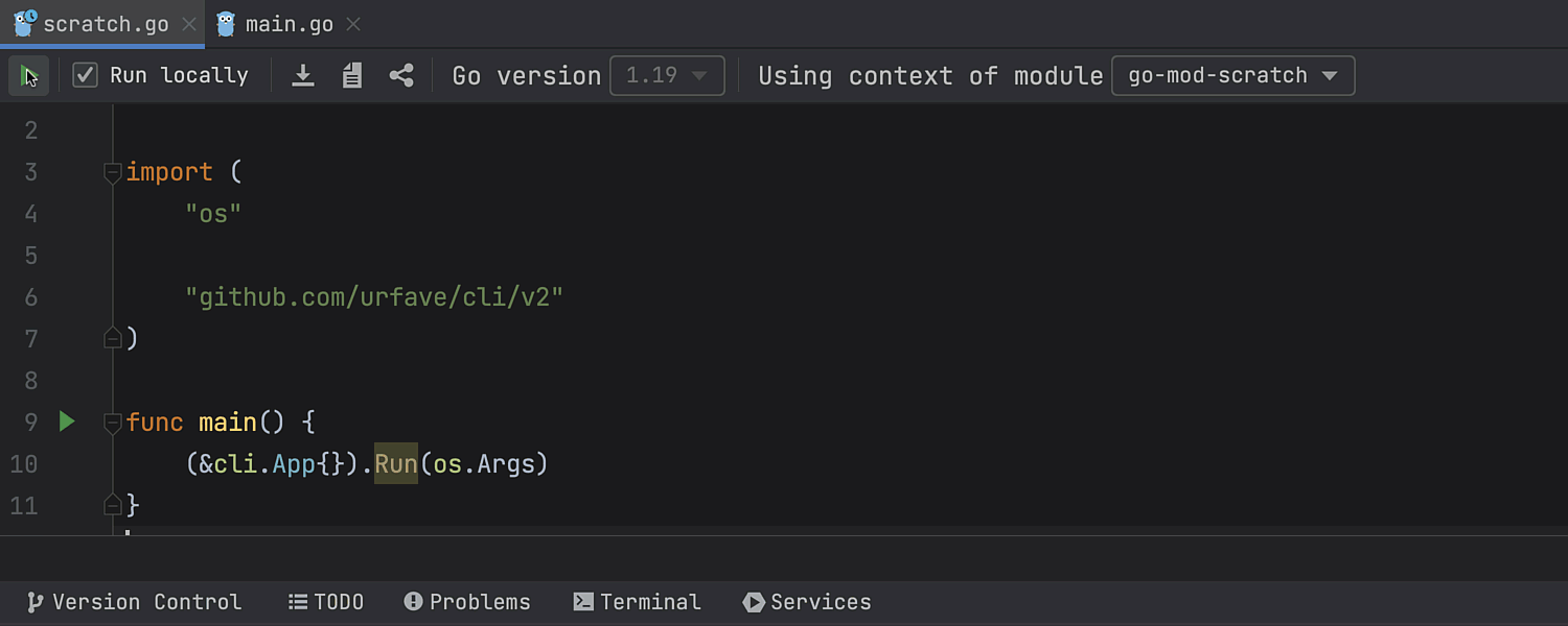 您现在可以使用非标准库 Go 依赖项运行临时文件。 将代码从项目文件复制到临时文件并按 Run(运行)按钮时,GoLand 会创建一个带有 -overlay 标志的 Run(运行)配置。 这个标志与将文件路径映射到原始项目中的 go.mod 和 go.sum 的 JSON 文件一起使用。