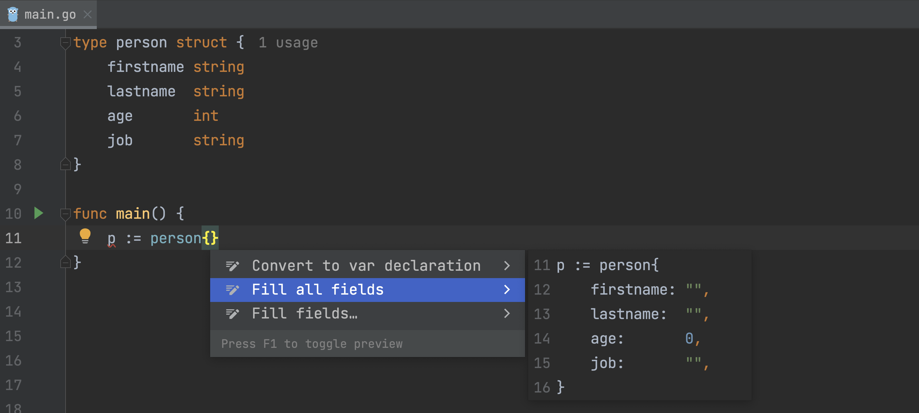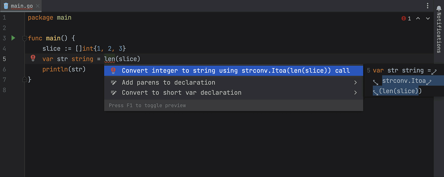 我们简化了这个工作流,GoLand 现在会直接建议 Convert integer to string using strconv.Itoa() call(使用 strconv.Itoa() 调用将整数转换为字符串)快速修复。