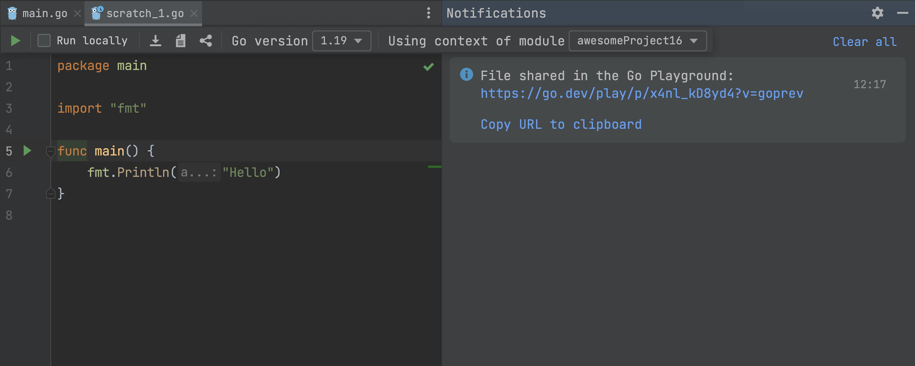 在 2022.3 版本中,我们将 Go Playground 功能集成到 GoLand 中。