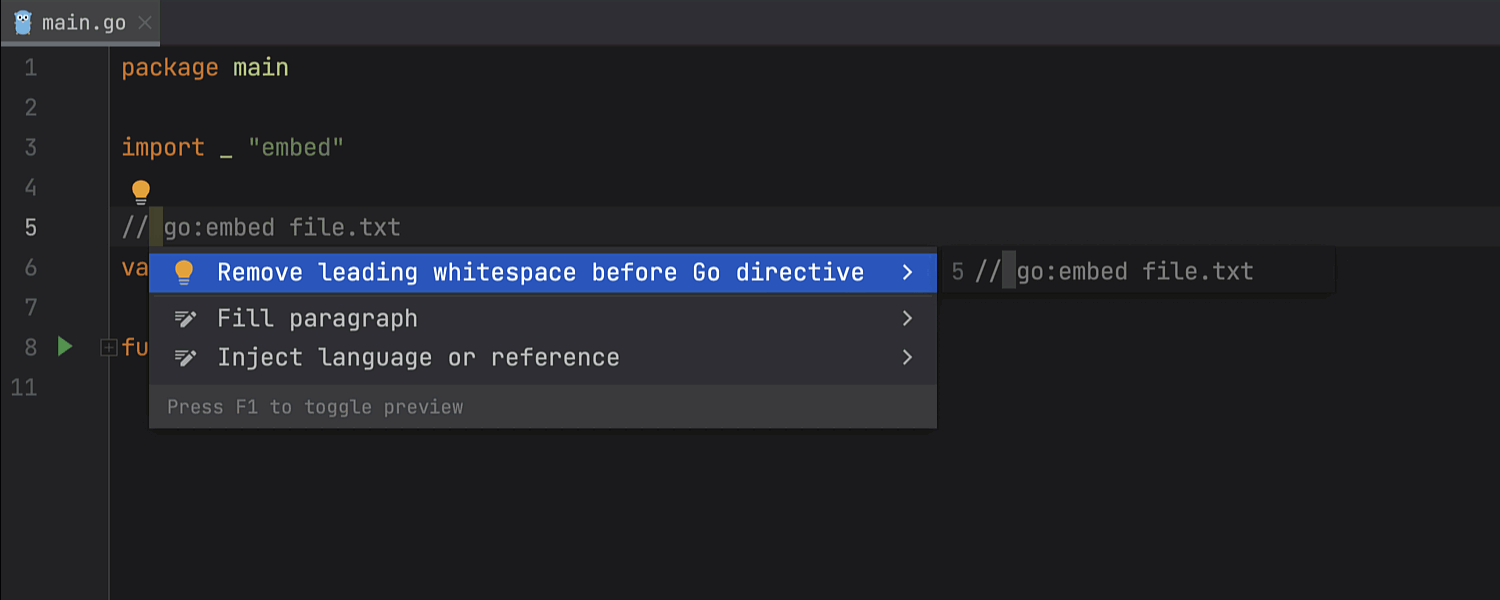 GoLand 新增的一项检查和快速修复可以帮助您检测和移除 Go 指令(如 //go:embed)中的前导空格。