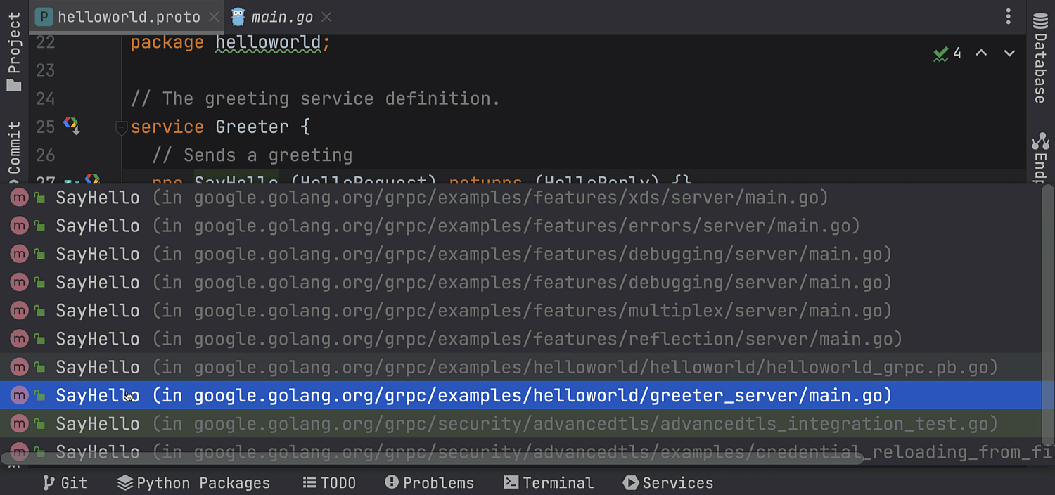 这个版本为我们的 gRPC 功能集提供了另一个有价值的补充。 您现在可以浏览和访问来自 Go 代码的消息、服务和方法的声明,以及来自 .proto 文件的 Go 实现。