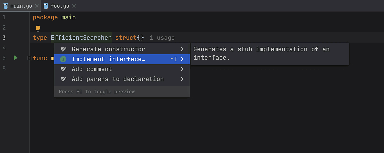 现在,您可以运行包含非标准库软件包的临时文件,使用正则表达式创建自己的搜索和替换检查,以及在原始字符串字面量与带双引号的字面量之间快速转换。 Implement interface(实现接口)意图操作现在适用于未导出的接口。