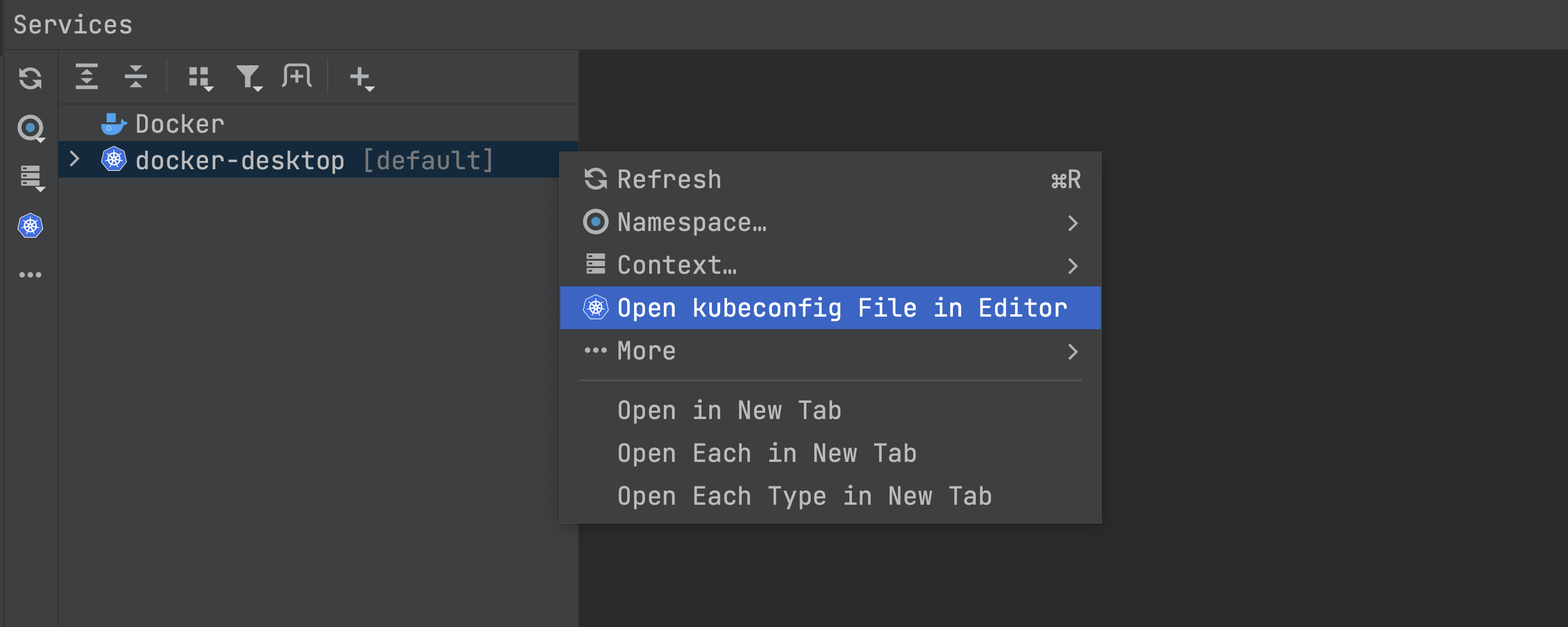您可以在 Services(服务)视图中轻松访问 kubeconfig 文件,并在编辑器中打开。 如果您在 GoLand 之外更改了 kubeconfig 文件,IDE 将检测到这一点并自动刷新 Services(服务)工具窗口中的配置。 此外,IDE 现在支持 kubeconfig 文件的代码高亮显示和补全。