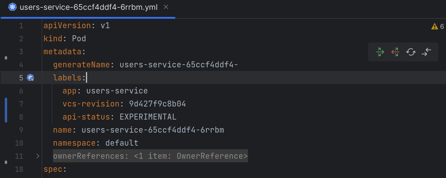 对集群中的资源使用 View YAML(查看 YAML)操作和更改打开的文件时,IDE 会在装订区域中使用颜色编码标记高亮显示所有编辑。 这样,您可以确保在应用回集群之前对资源所需部分完成了更改。